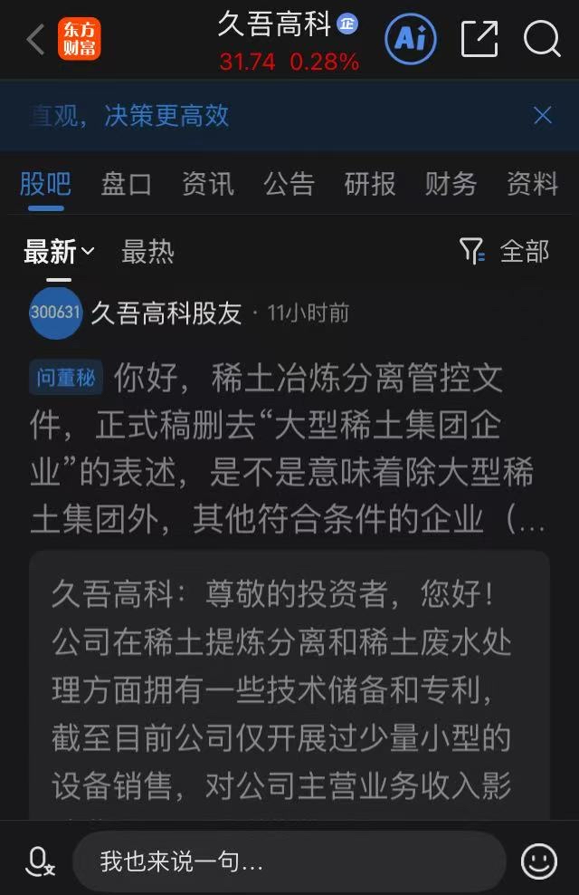 $久吾高科(SZ300631)$ 买进来的都是些啥保胎产物,找找每年业绩披露和审计报告看看营收栏就知道没有稀土业务,而且它的产品只是可以用在稀土废液二次提取,那么问题来了,轻稀土本身就比白菜还便宜,为了二次提取废液去专门花钱买你的产品?稀土公司跟你们一样没长脑子?还问董秘能不能去拿稀土配额。等这些春货深套个40个点不说话了就可以进了