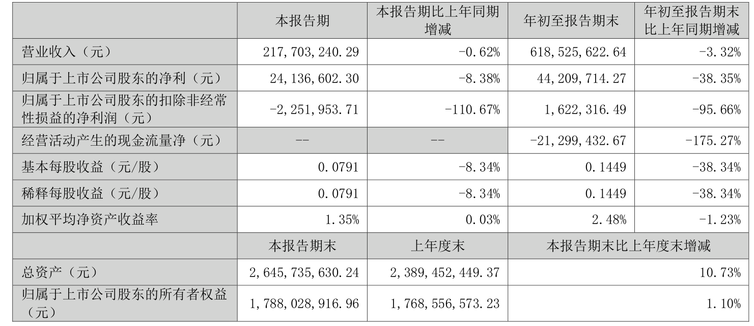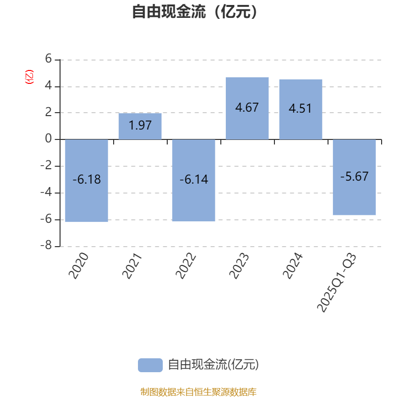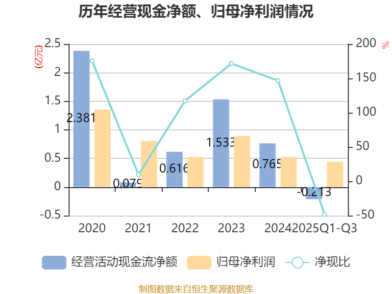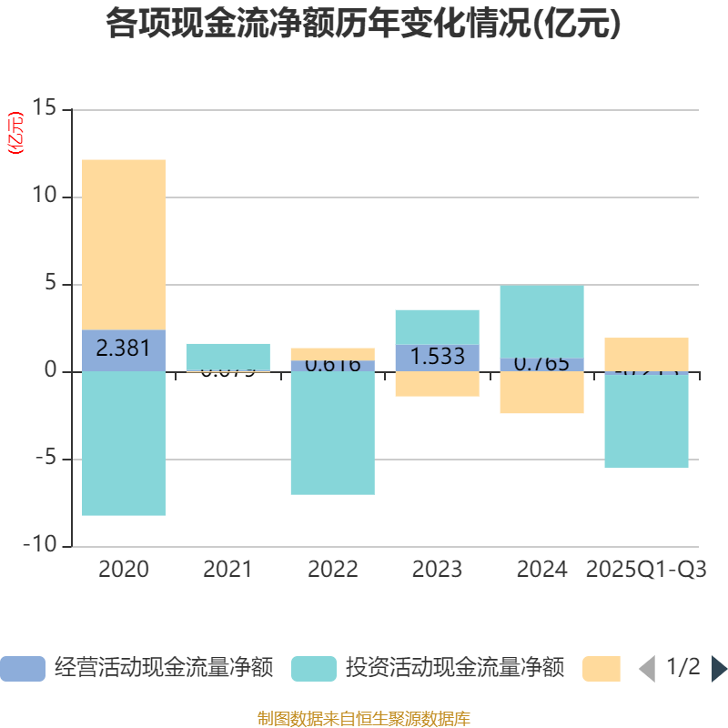 2025年前三季度,公司经营活动现金流净额为-2129.94万元,同比减少4959.62万元;筹资活动现金流净额1.92亿元,同比增加3.86亿元;投资活动现金流净额-5.31亿元,上年同期为-8896.95万元。