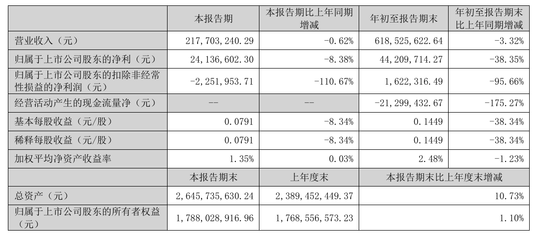 10月17日晚间,光莆股份(深市代码:300632)发布2025年三季度报告。数据显示,该公司前三季度营收约6.19亿元,同比减少3.32%;归属于上市公司股东的净利润约4420.97万元,同比减少38.35%;扣非净利润约162.23万元,同比锐减95.66%。