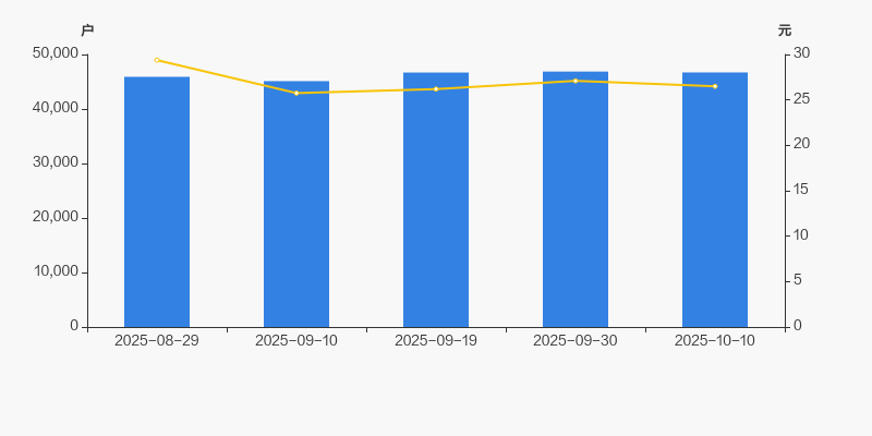 2025年8月29日至今,公司股东户数有所增长,区间涨幅为1.74%。2025年8月29日至2025年10月10日区间股价下降9.79%。