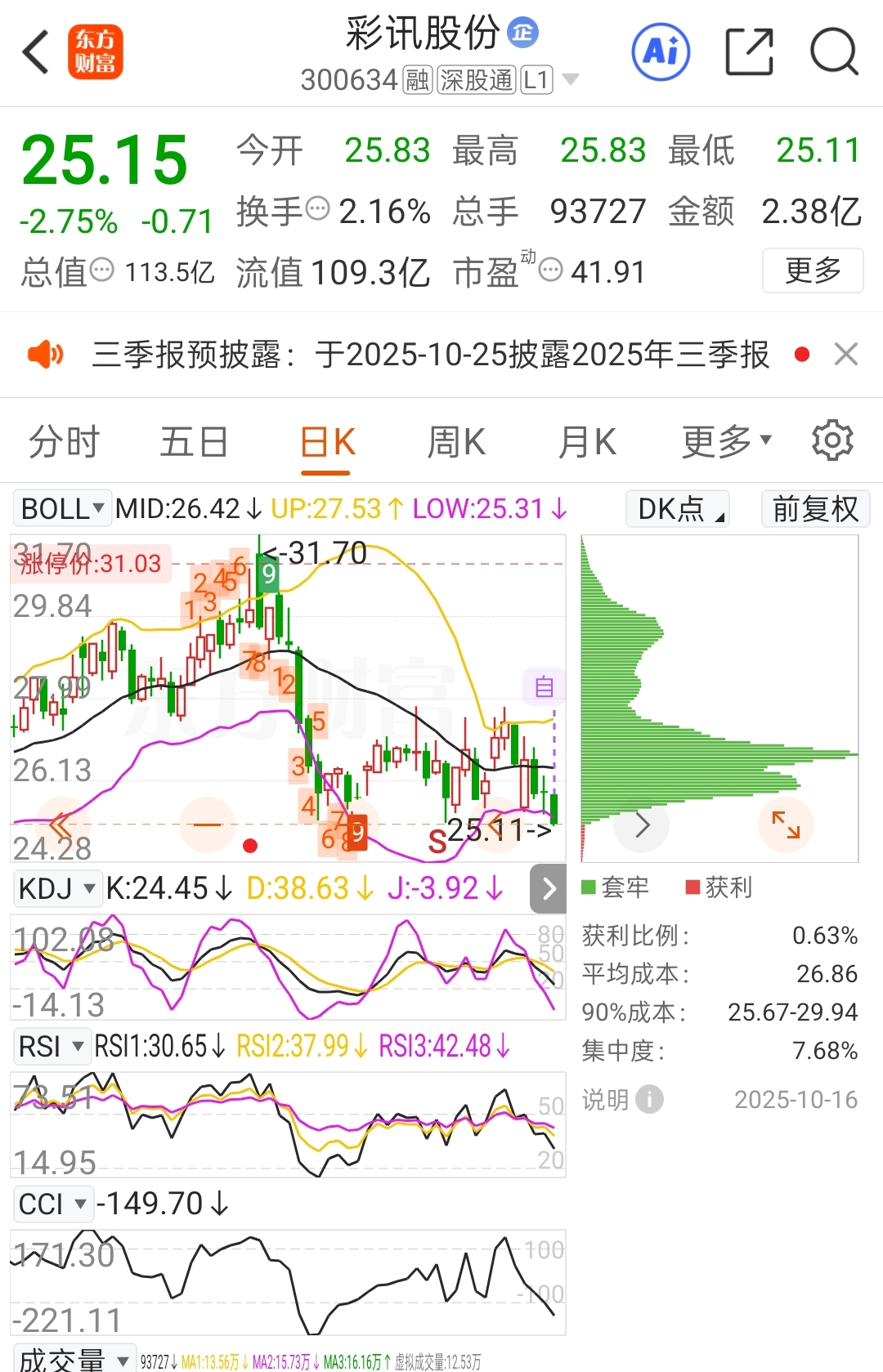 $彩讯股份(SZ300634)$ 下轨25.31,就这么轻易地破下轨了。彩讯跟前天与昨天的易事特类似,缩量跌,盘中震荡好几个点。看看彩讯明天与下周是否复制易事特的走势。
