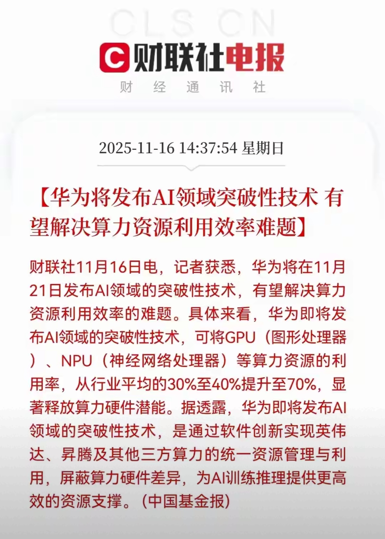 华为将发布AI领域突破性技术,有望将GPU等算力资源利用率从行业平均的3、40%