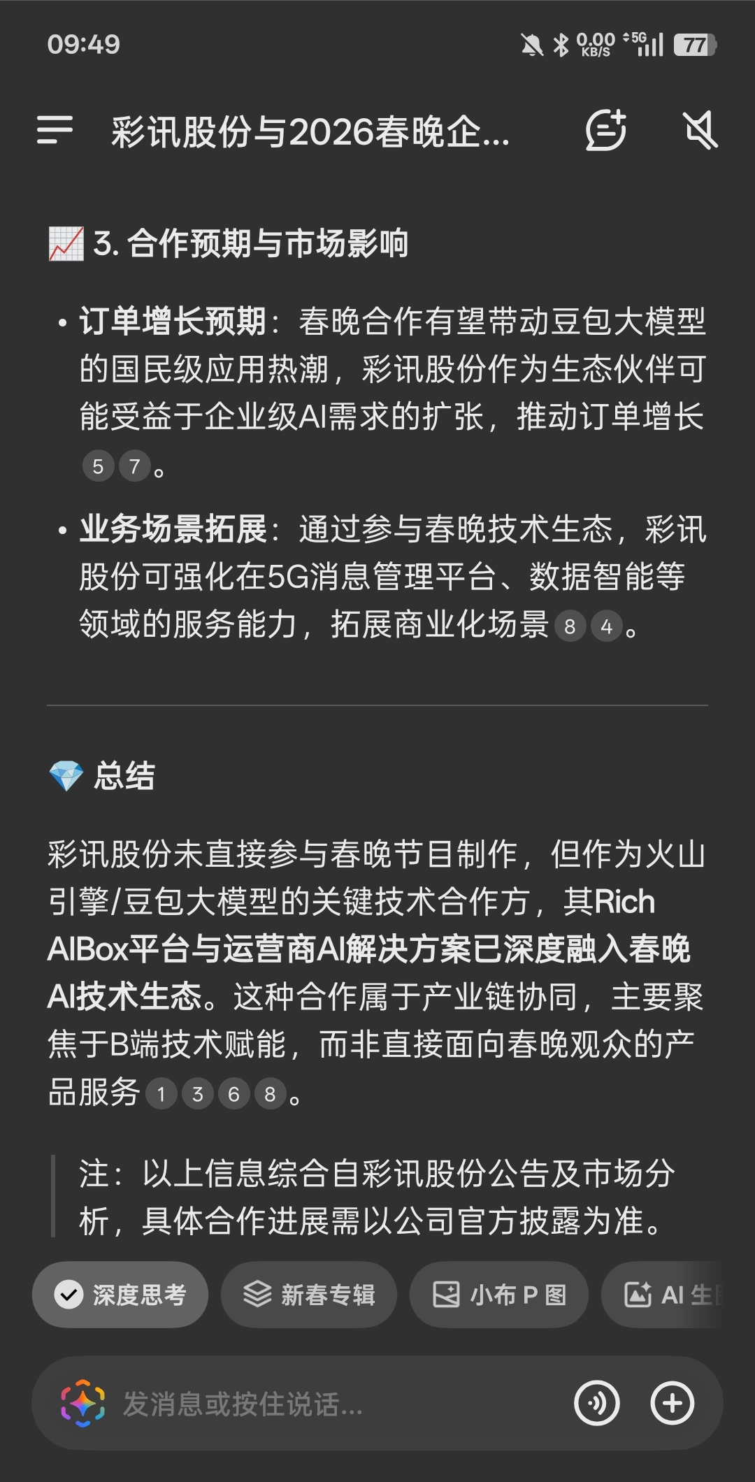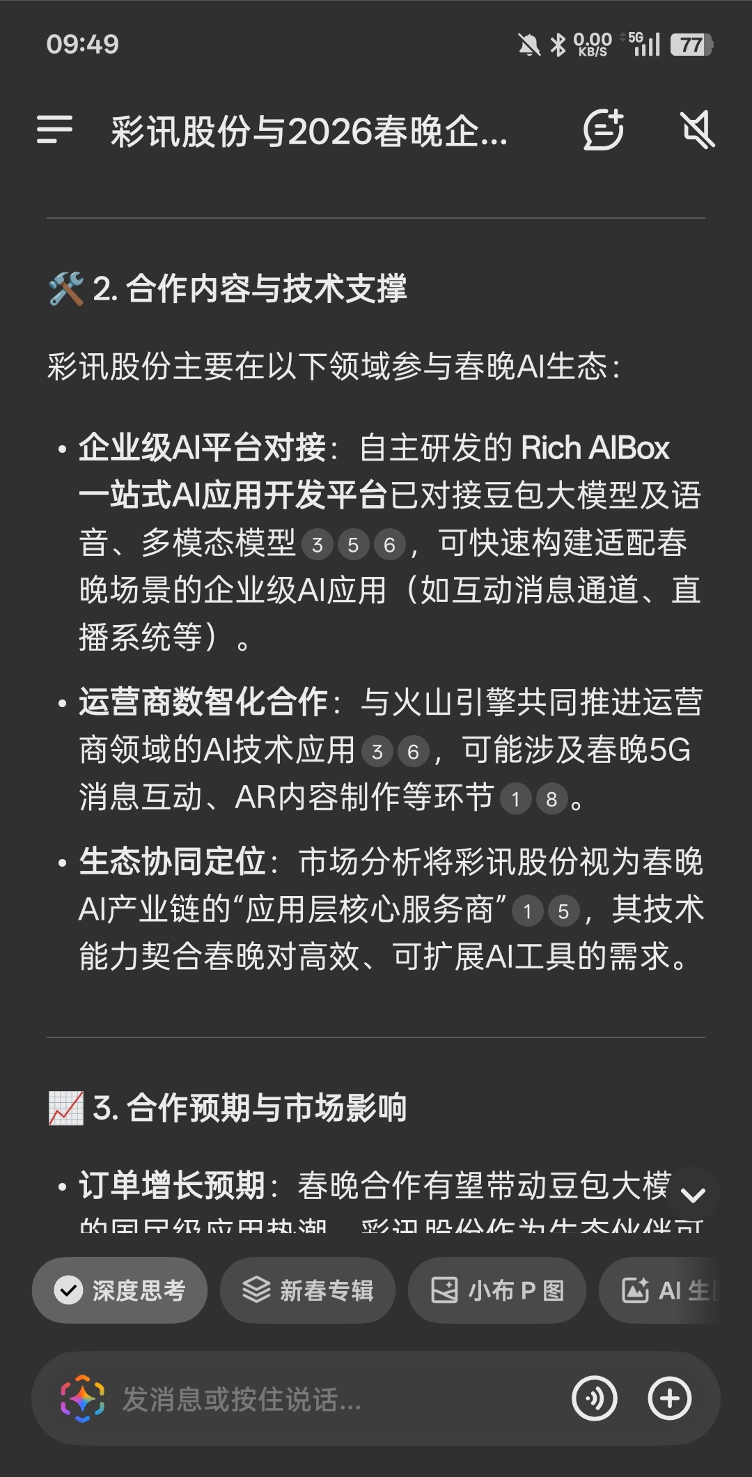 昨晚的春节晚会主题就是机器人和AI人工智能,刚才问了一下豆包,彩讯股份和参加春节