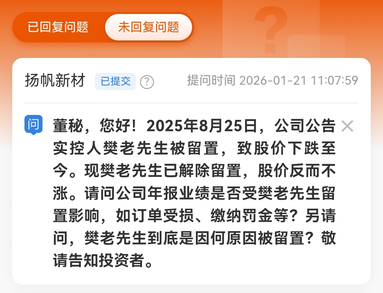 董秘一般多久一次选问题集中回复投资者的提问?$扬帆新材(SZ300637)$