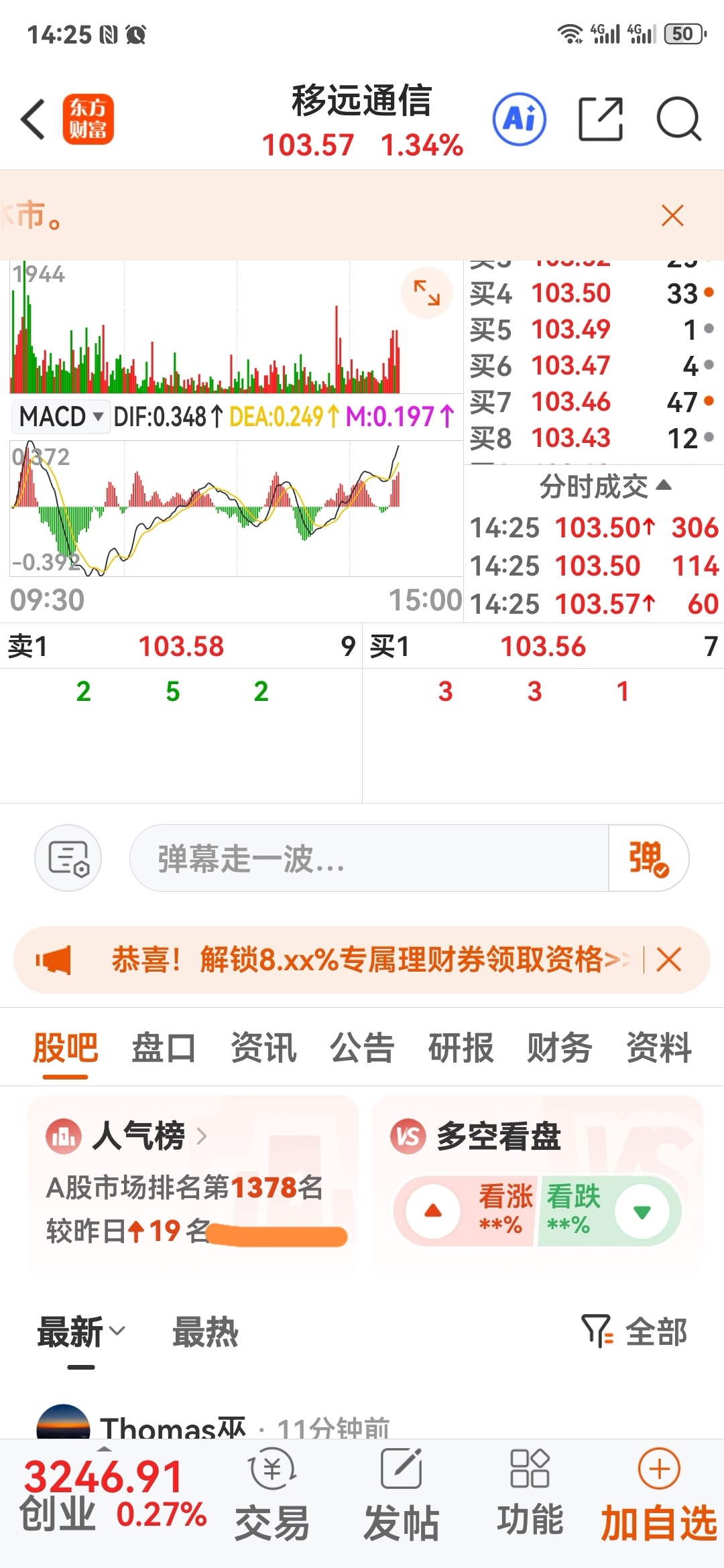 此股的市场人气比移远通信还高,这叫什么事,人家移远通信已经红