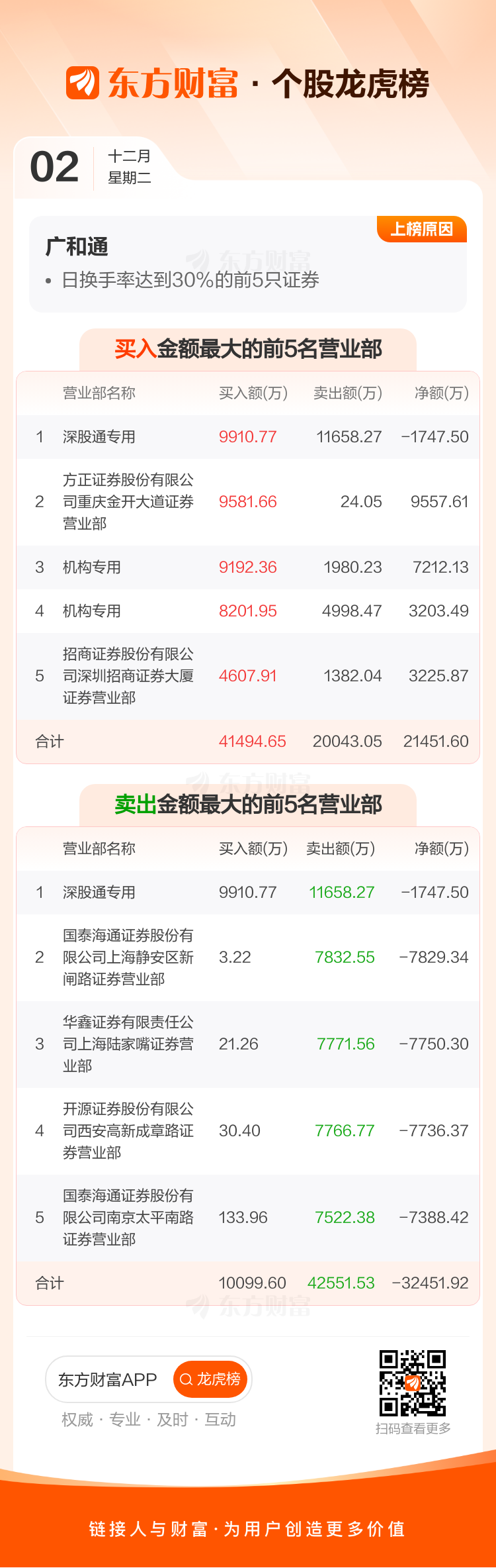 交易所2025年12月2日公布的交易公开信息显示,广和通因成为日换手率达到30%的前5只证券上榜。广和通当日收报34.4元,涨跌幅6.24%,偏离值35.60%,换手率35.60%,成交额61.91亿。