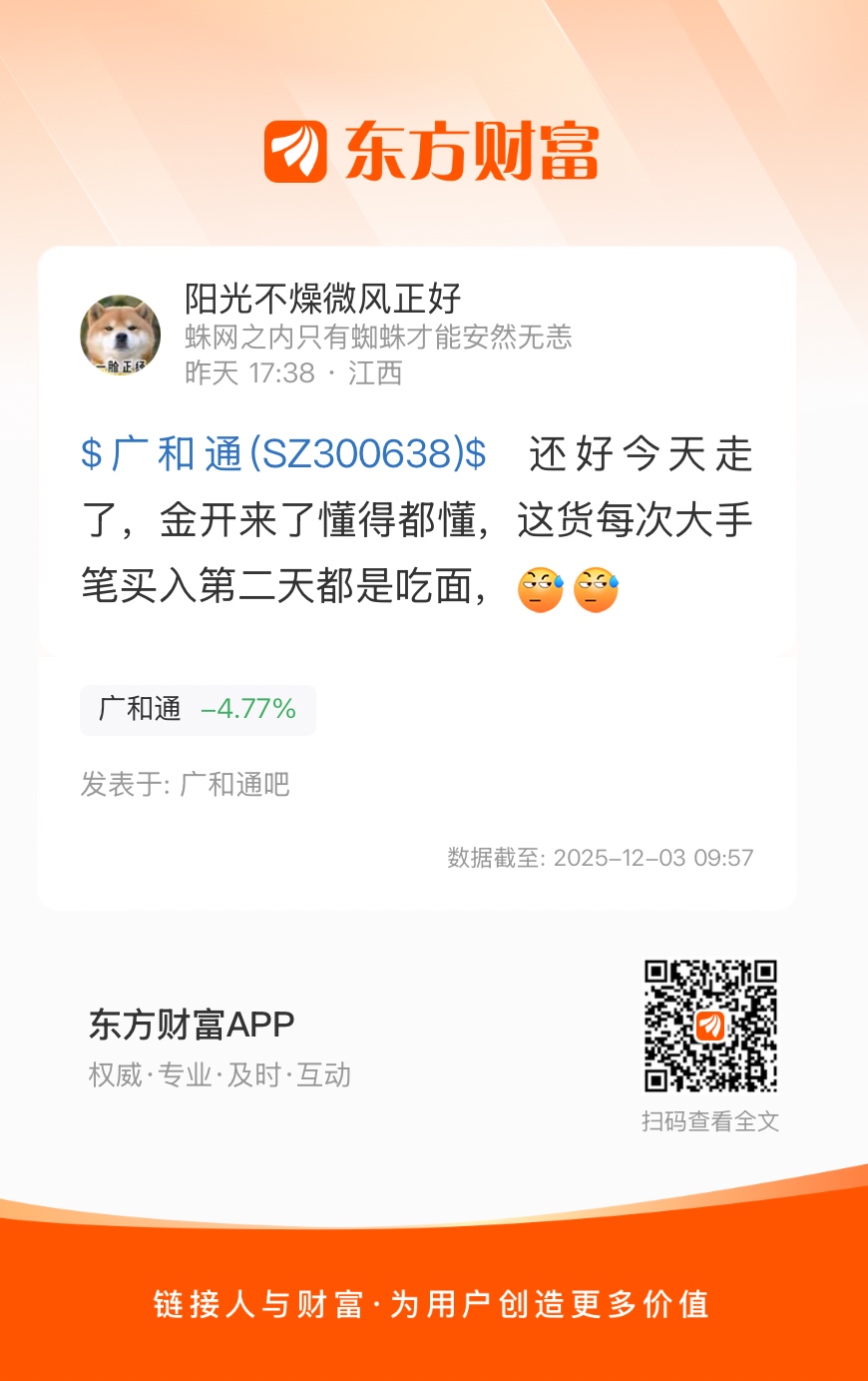 $广和通(SZ300638)$  还好今天走了,金开来了懂得都懂,这货每次大手笔买入第二天都是吃面,