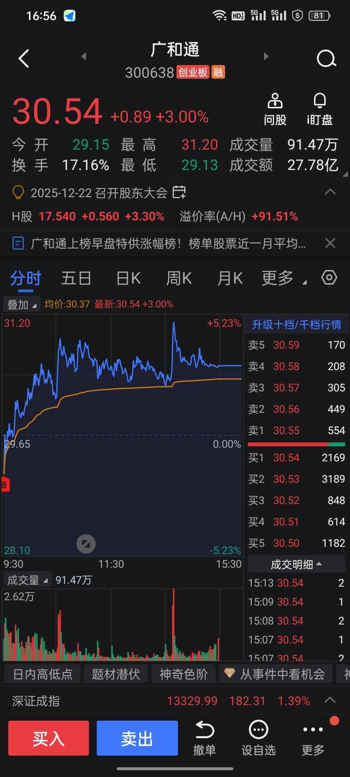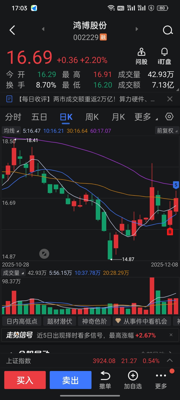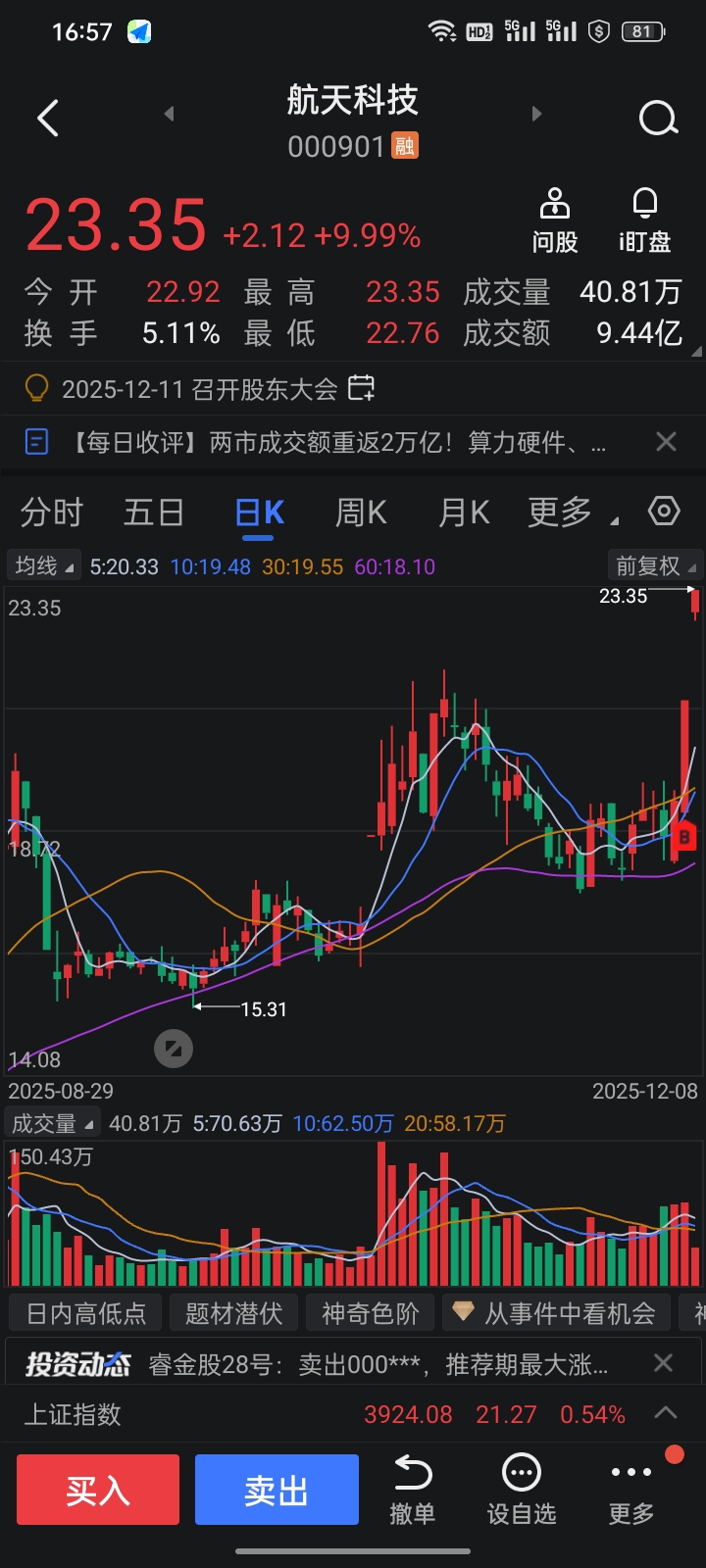 早盘集合竞价买入了广和通,逢高卖出了鸿博股份,航天科技继续持有观望,周五逢高减仓