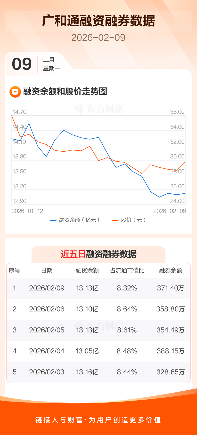 交易所最新数据显示,广和通于2026年2月9日获融资买入7604.75万元,融资偿还7307.52万元,当日融资净买入297.23万元。目前,该股融资余额13.13亿,占流通市值比例为8.32%。