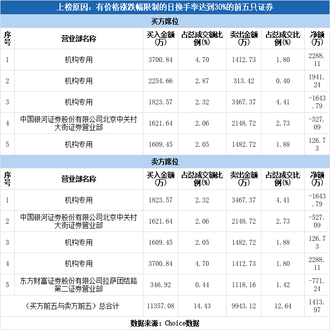 龙虎榜数据显示,今日共7个机构席位出现在龙虎榜单上,分别位列买一、买二、买三、买五、卖一、卖三、卖四,合计净买入2712.29万元,占龙虎榜净买额的191.82%。除此之外还有神农种业、雪人集团、艾森股份等36只个股榜单上出现了机构的身影,其中13家呈现机构净买入,获净买入最多的是神农种业,净买额为2.24亿元;23家呈现机构净卖出,其中遭净卖出最高的为通宇通讯,净卖额为1.20亿元。