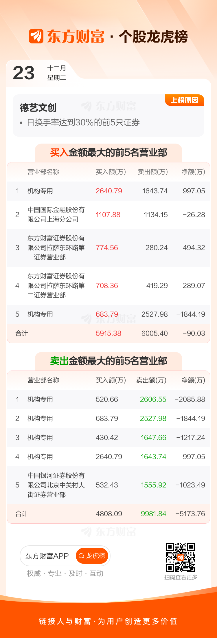 交易所2025年12月23日公布的交易公开信息显示,德艺文创因成为日换手率达到30%的前5只证券上榜。德艺文创当日收报9.05元,涨跌幅0.33%,偏离值35.50%,换手率35.50%,成交额7.08亿。