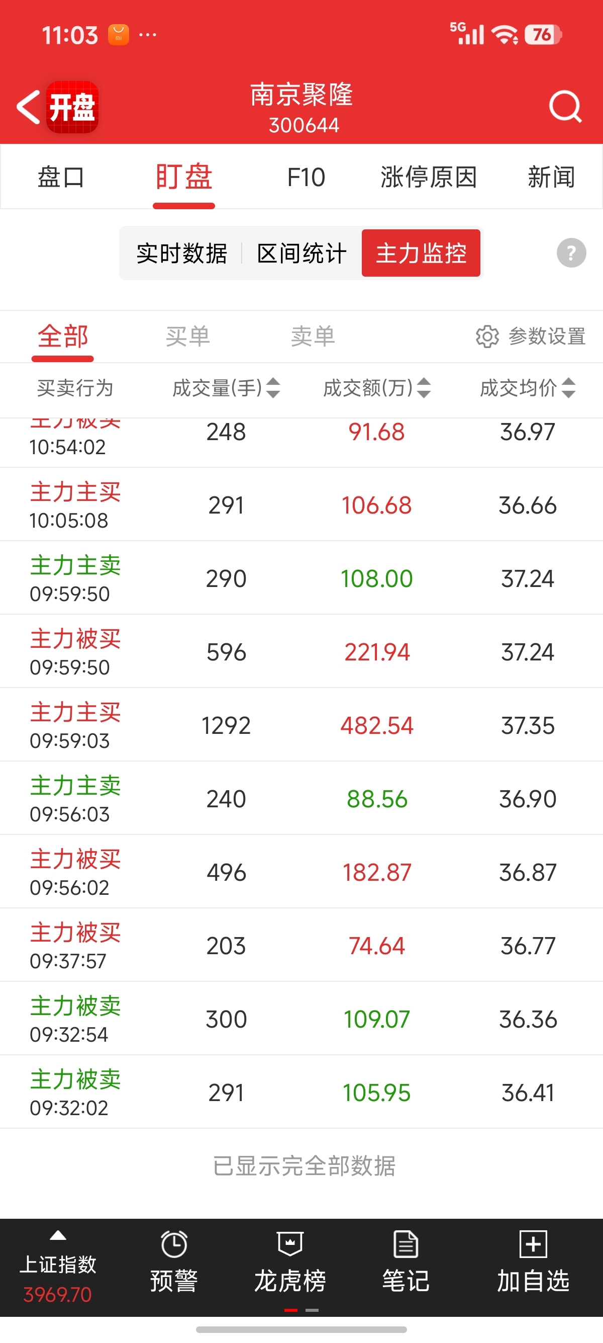 给大家看看很多人看不到的东西:到11点实际成交就这些笔数,分时线看到的那些都是表