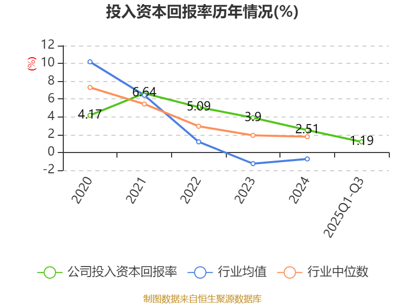 盈利能力方面, 2025年前三季度公司加权平均净资产收益率为0.62%,同比下降0.3个百分点。公司2025年前三季度投入资本回报率为1.19%,较上年同期下降0.15个百分点。