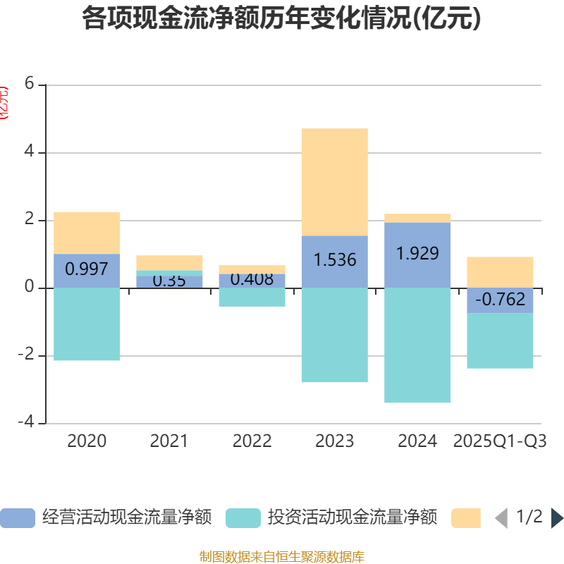2025年前三季度,公司经营活动现金流净额为-7624.91万元,同比增加1.04亿元;筹资活动现金流净额9079.51万元,同比减少1870.65万元;投资活动现金流净额-1.63亿元,上年同期为-2.02亿元。