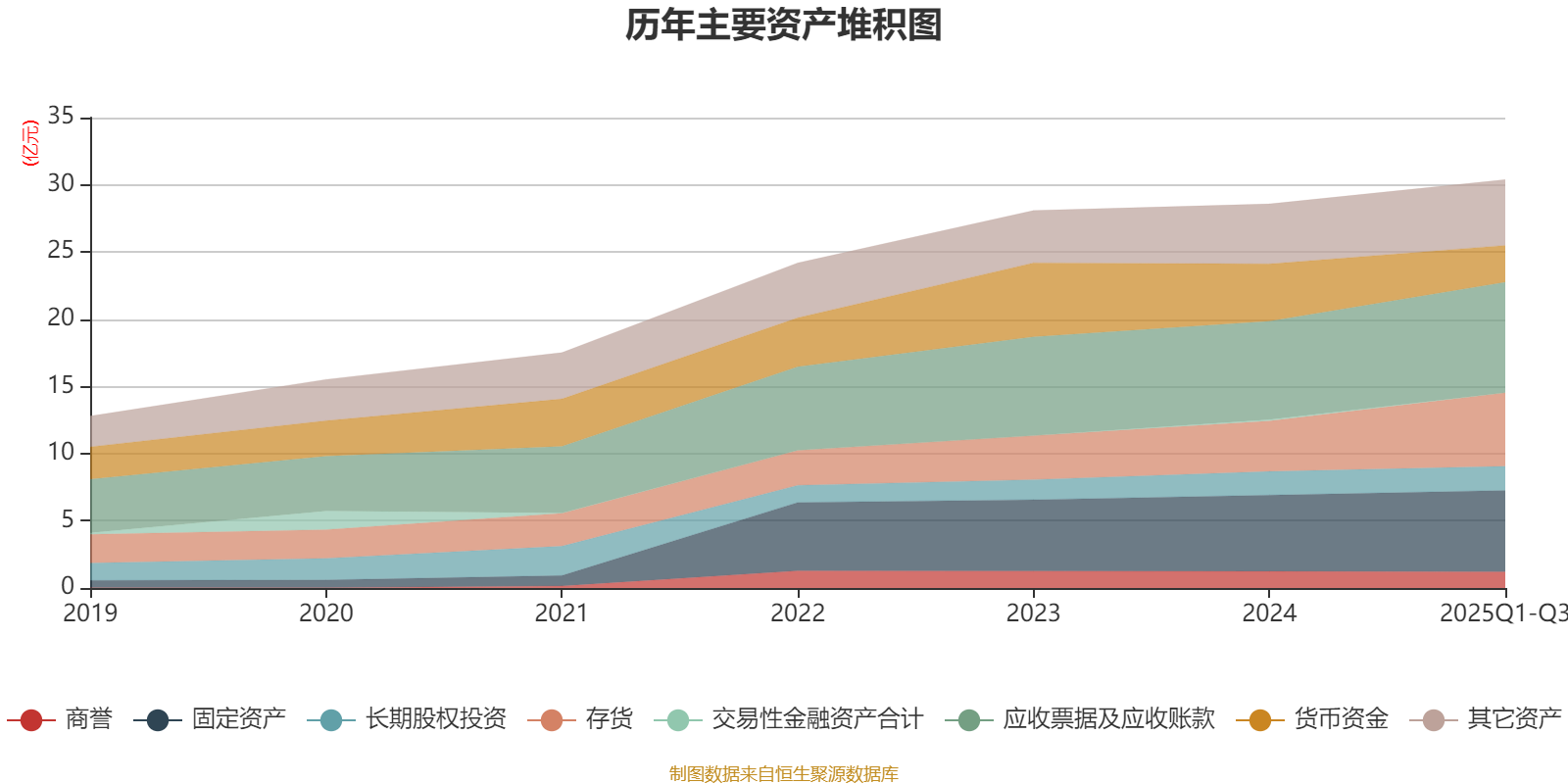 资产重大变化方面,截至2025年三季度末,公司货币资金较上年末减少35.93%,占公司总资产比重下降5.94个百分点;存货较上年末增加45.71%,占公司总资产比重上升4.88个百分点;应收票据及应收账款较上年末增加12.2%,占公司总资产比重上升1.42个百分点;无形资产较上年末减少16.94%,占公司总资产比重下降0.75个百分点。