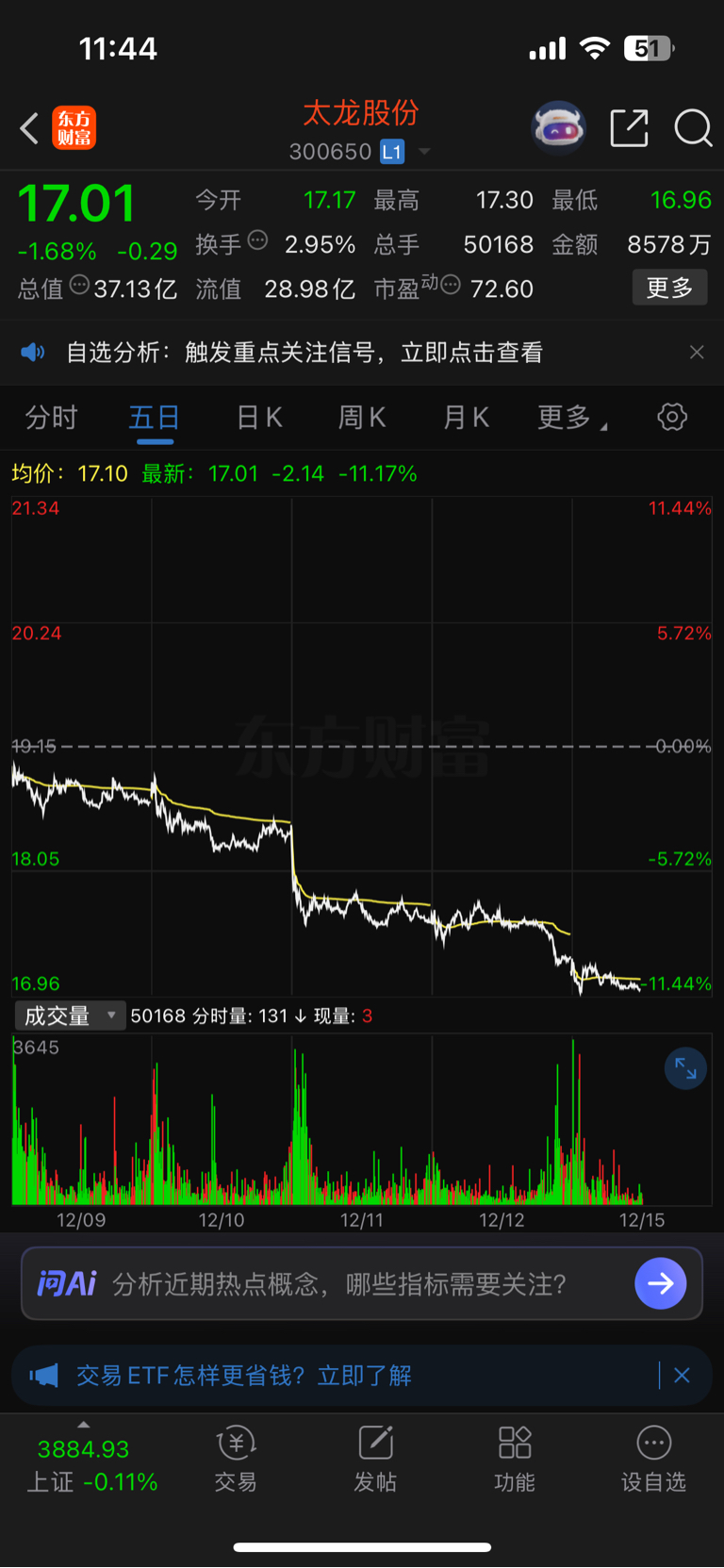 $太龙股份(SZ300650)$ 持续跌了五天了 绿的疲倦了没 好赖红一天差一下么