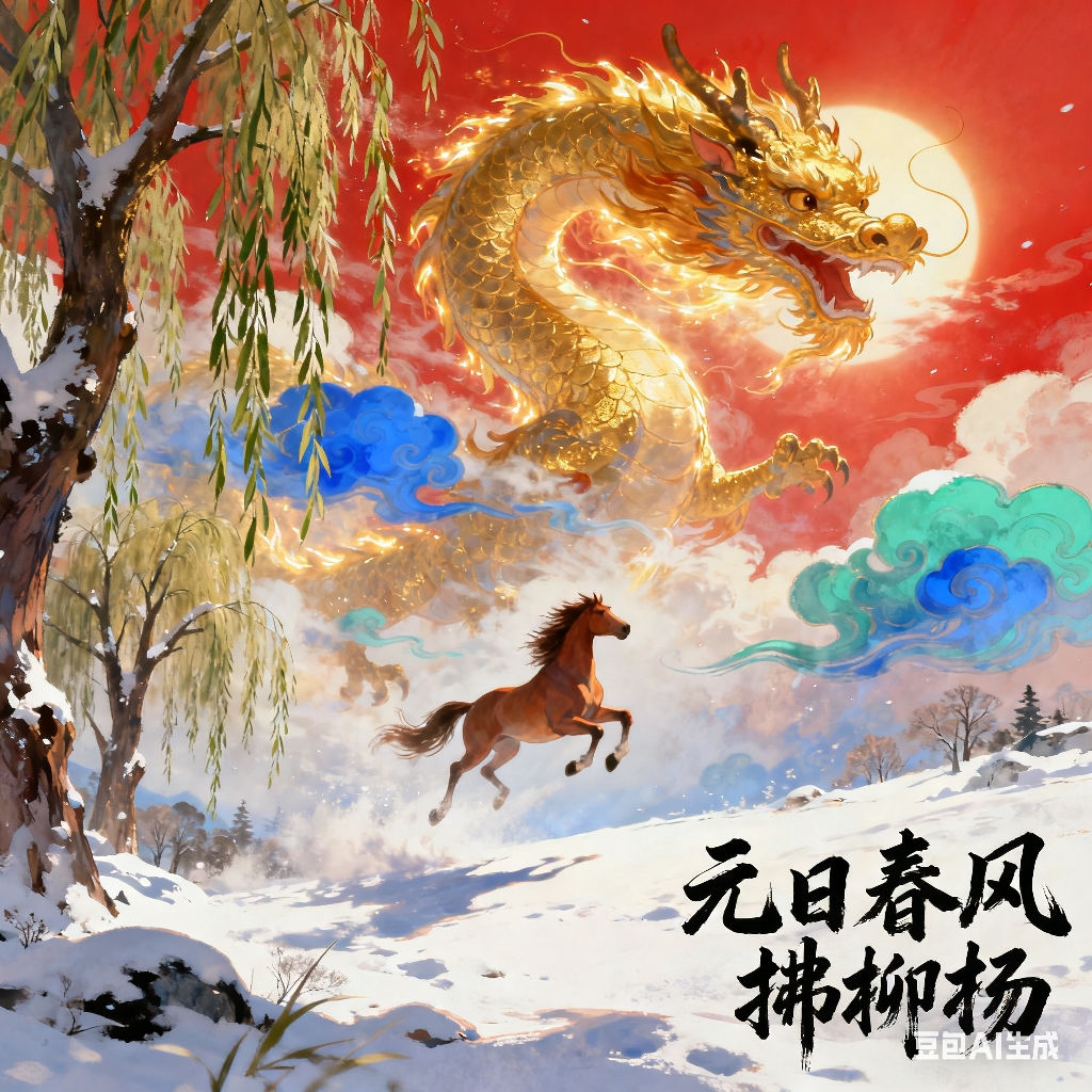 元日春风拂柳杨,太龙腾跃破穹苍。神驹踏雪开新运,直上青云万里长。
