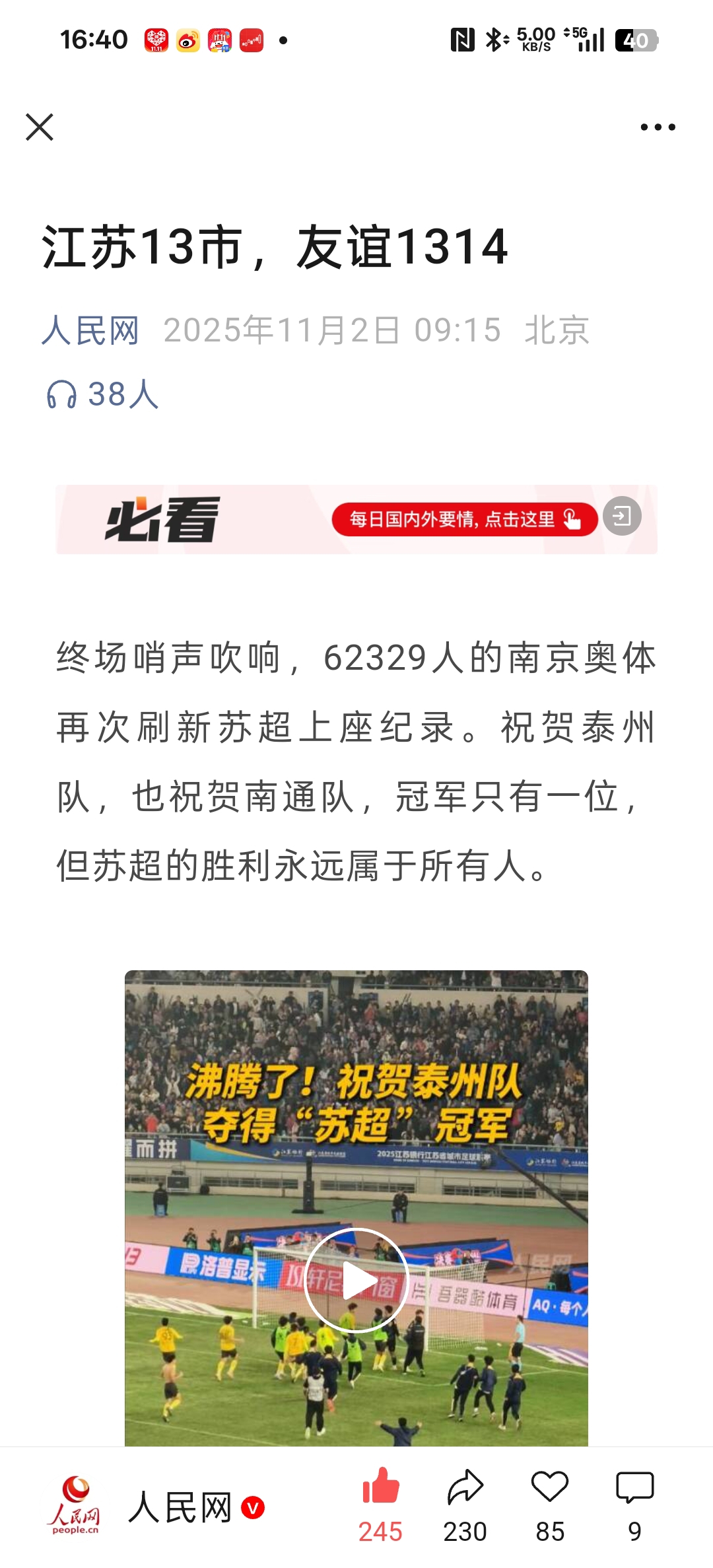 $金陵体育(SZ300651)$ 苏超 人民网一直报道,高层对体育的看重!各省超也在进行!