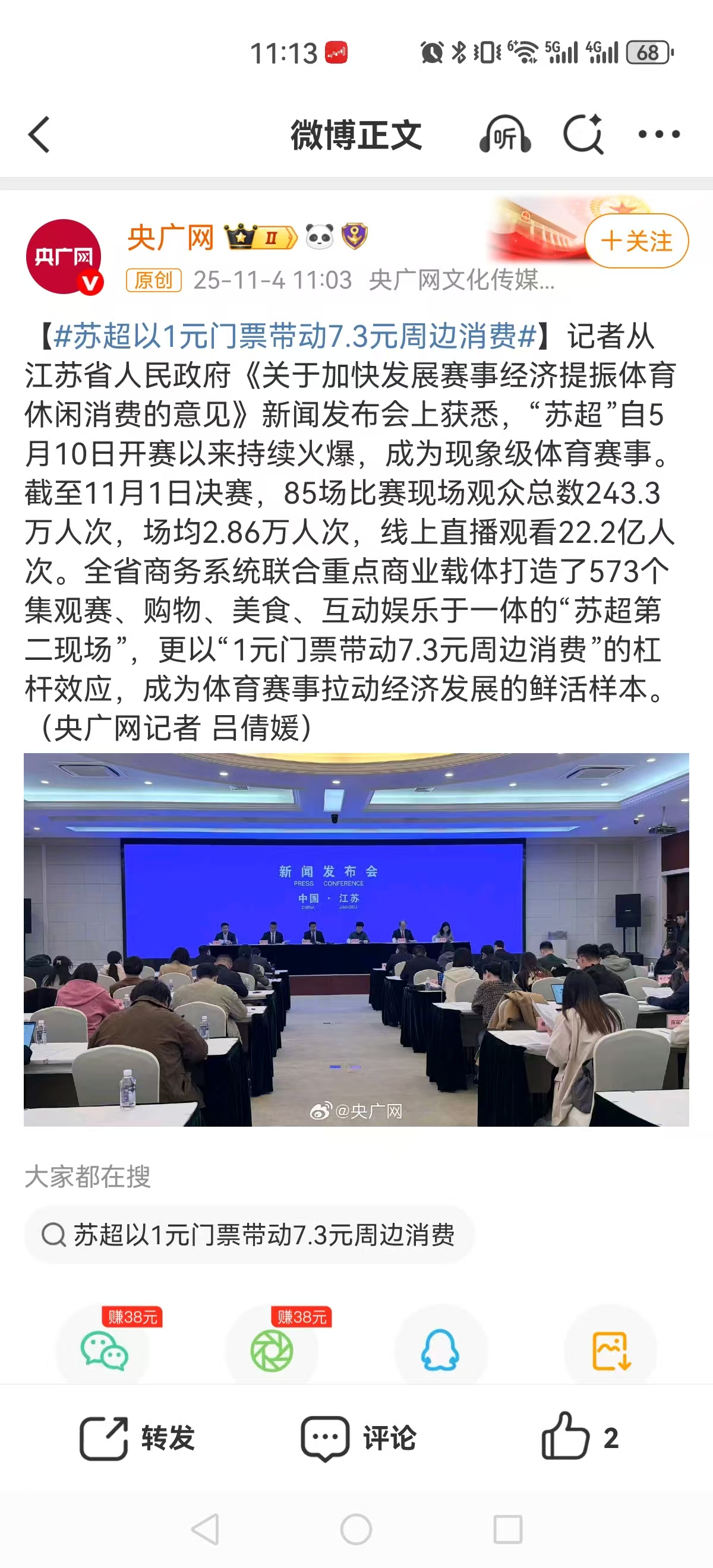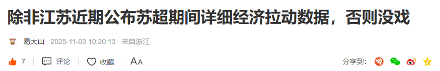 $共创草坪(SH605099)$ $金陵体育(SZ300651)$ 我昨天说了,除非江苏公布苏超整个赛季期间详细的经济拉动数据,否则是没戏的,因为这份数据放在当下的经济环境里绝对是超级亮眼的,是上头想要的新经济和消费内循环典范案例,数据只要发布,官媒肯定会下场报导,各大媒体财经自媒体也会纷纷来解读这份数据,从来带来新一轮流量的增长。