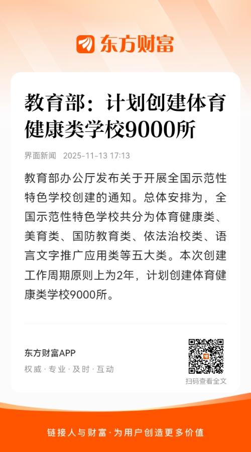 教育部办公厅发布关于开展全国示范性特色学校创建的通知。总体安排为,全国示范性特色学校共分为体育健康类、美育类、国防教育类、依法治校类、语言文字推广应用类等五大类。本次创建工作周期原则上为2年,计划创建体育健康类学校9000所(青少年校园足球特色学校、体育传统特色学校);美育类学校5000个、基地200个;国防教育类学校4000所;依法治校类学校300—400所;语言文字推广应用类学校300所。