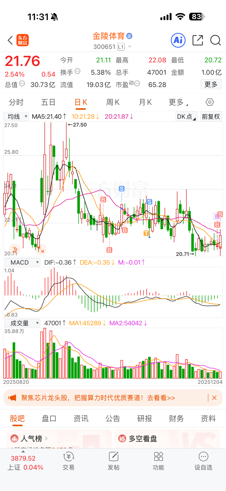 $金陵体育(SZ300651)$ 一起发财#炒股日记#