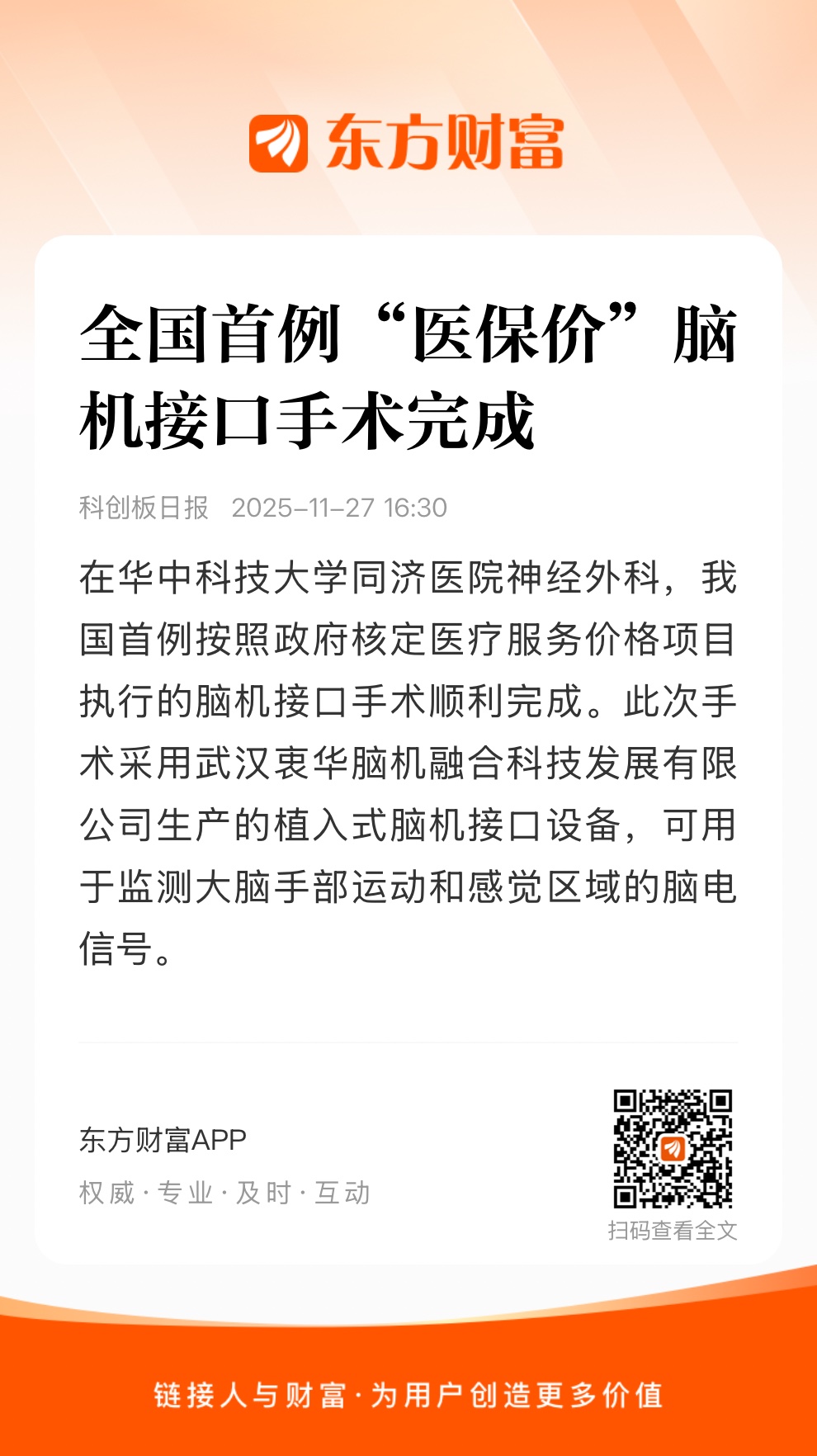 在华中科技大学同济医院神经外科,我国首例按照政府核定医疗服务价格项目执行的脑机接口手术顺利完成。此次手术采用武汉衷华脑机融合科技发展有限公司生产的植入式脑机接口设备,可用于监测大脑手部运动和感觉区域的脑电信号。