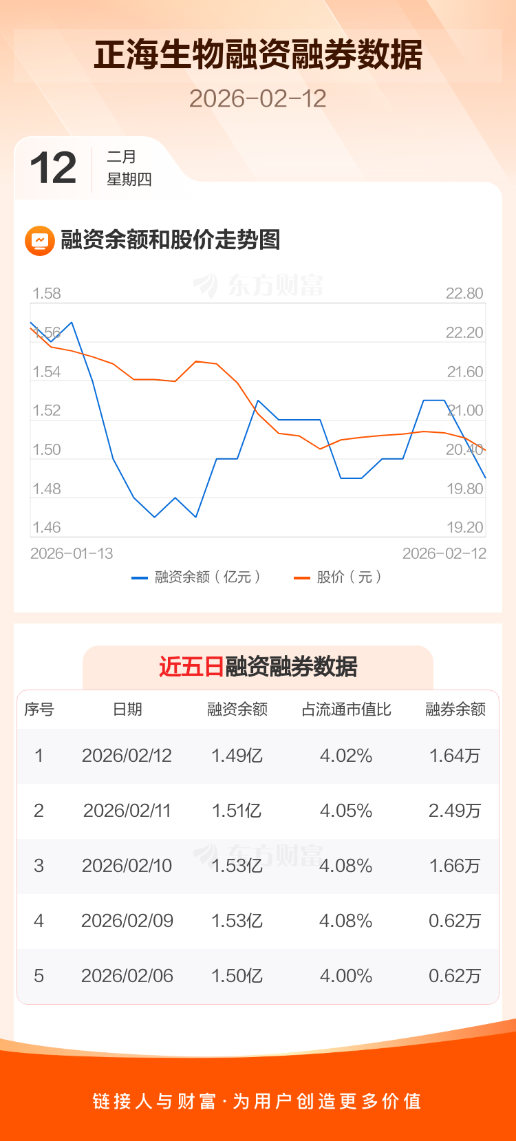 交易所最新数据显示,正海生物于2026年2月12日获融资买入330.21万元,融资偿还578.23万元,当日融资净偿还248.02万元。目前,该股融资余额1.49亿,占流通市值比例为4.02%。