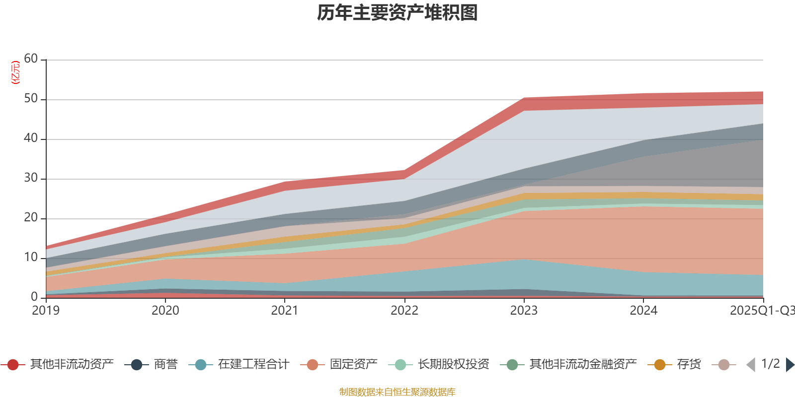 资产重大变化方面,截至2025年三季度末,公司交易性金融资产合计较上年末增加61.55%,占公司总资产比重上升8.64个百分点;货币资金较上年末减少40.83%,占公司总资产比重下降6.57个百分点;在建工程合计较上年末减少12.17%,占公司总资产比重下降1.47个百分点;其他流动资产较上年末减少31.1%,占公司总资产比重下降0.76个百分点。