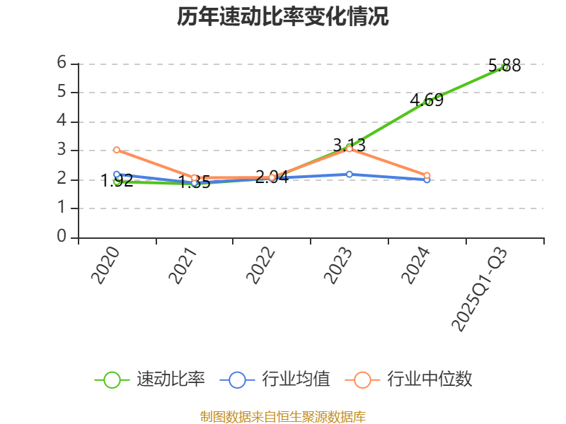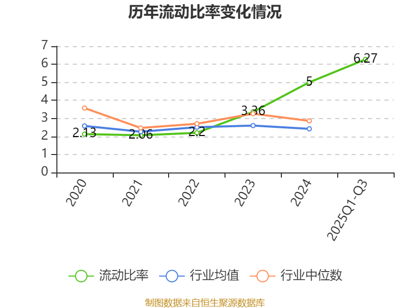 2025年前三季度,公司流动比率为6.27,速动比率为5.88。