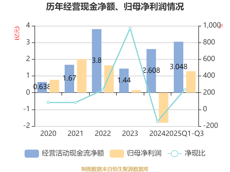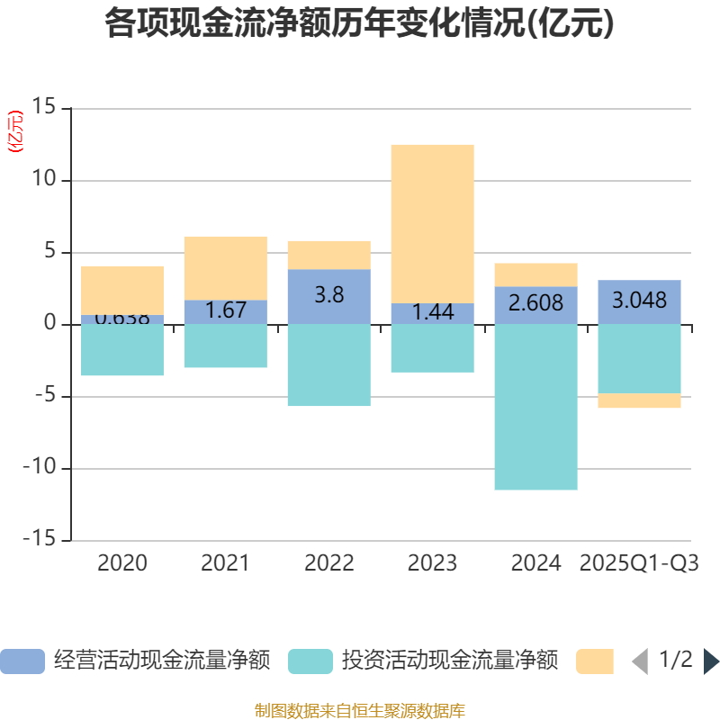 2025年前三季度,公司经营活动现金流净额为3.05亿元,同比增长100.87%;筹资活动现金流净额-9983.42万元,同比减少3.14亿元;投资活动现金流净额-4.83亿元,上年同期为-12.74亿元。