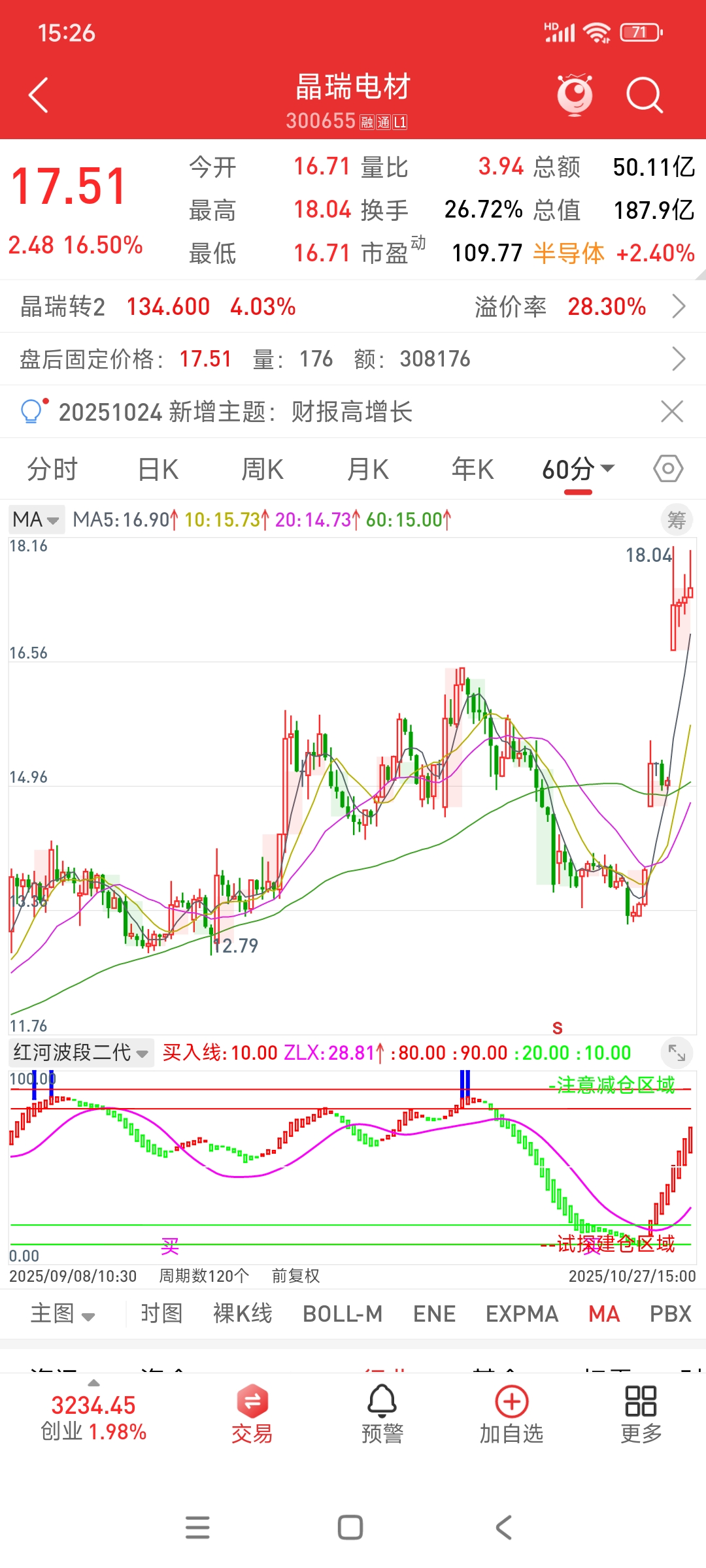 $晶瑞电材(SZ300655)$ 这个也是经典的小级别反转带动大级别,60分钟底部出现买字叠加绿柱转红柱,价格就一路上扬,毕竟红柱不停,上涨不止,红柱拉长,加速不止,继续冲