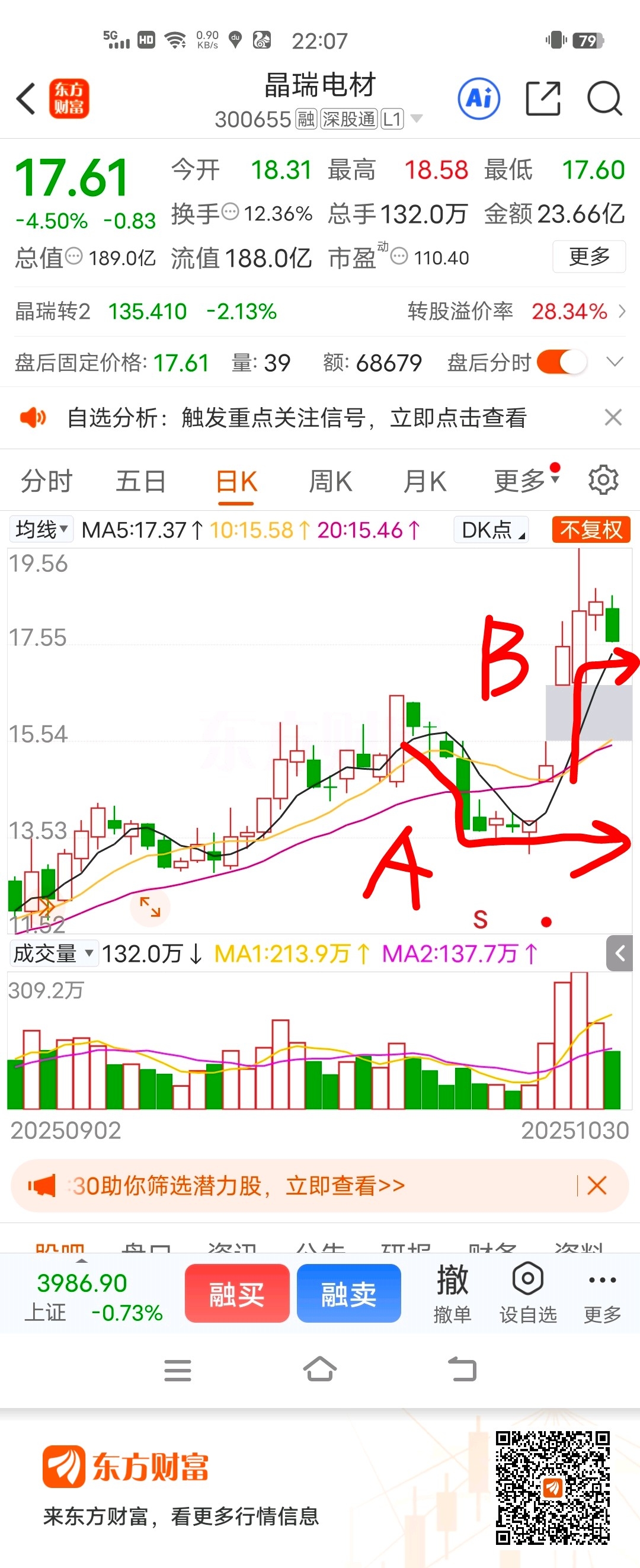 $晶瑞电材(SZ300655)$ 看K线图——A线:主力拉高至16.5元后,反手急速打低至不到14元,再横盘4天完成迅速吸筹。B线:然后从14元起,急速拉升,不给他人任何机会,目前正在做拉升30%后进行洗盘的惯常动作。所以说:这一波其正常的升幅一定是翻倍,也就是说28元,而现在只是上升过程的正常调整而已!