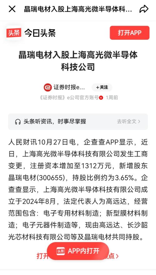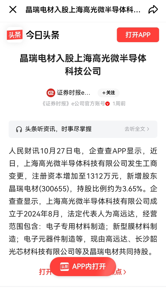 $晶瑞电材(SZ300655)$ 上海高光微半导体科技有限公司发生工商变更,注册资本增加至1312万元,新增股东晶瑞电材(300655.SZ),持股比例约为3.65%。这才是晶瑞电材上涨的资本!