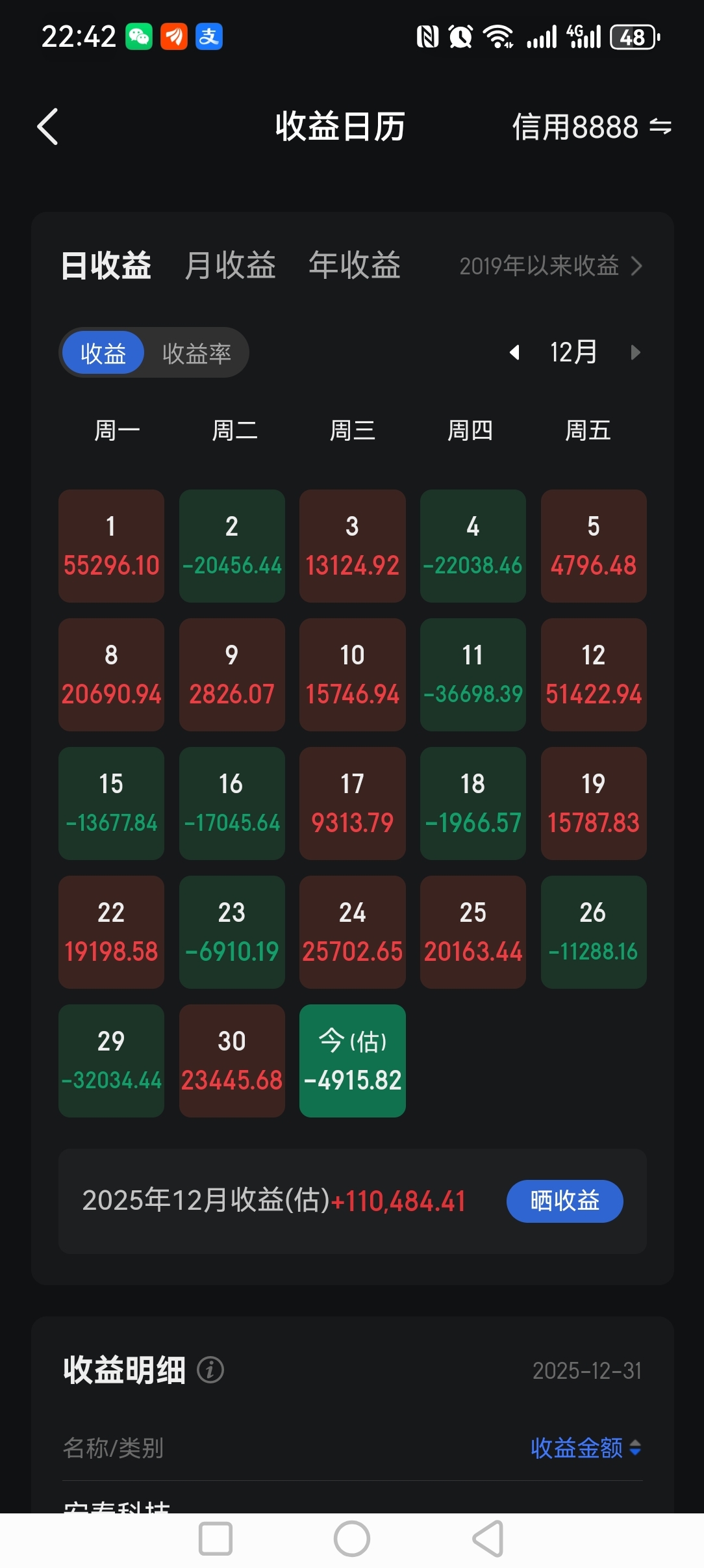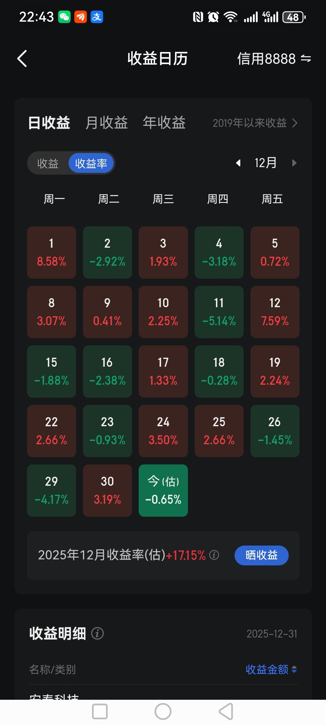 12月胆战心惊赚了17.15%,今年最后一天亏小5000块。