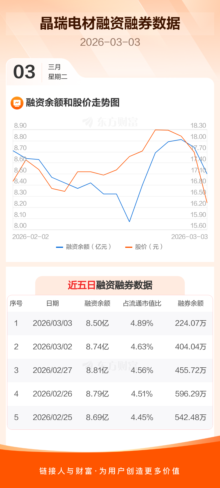 交易所最新数据显示,晶瑞电材于2026年3月3日获融资买入7048.10万元,融资偿还9424.19万元,当日融资净偿还2376.09万元。目前,该股融资余额8.50亿,占流通市值比例为4.89%。