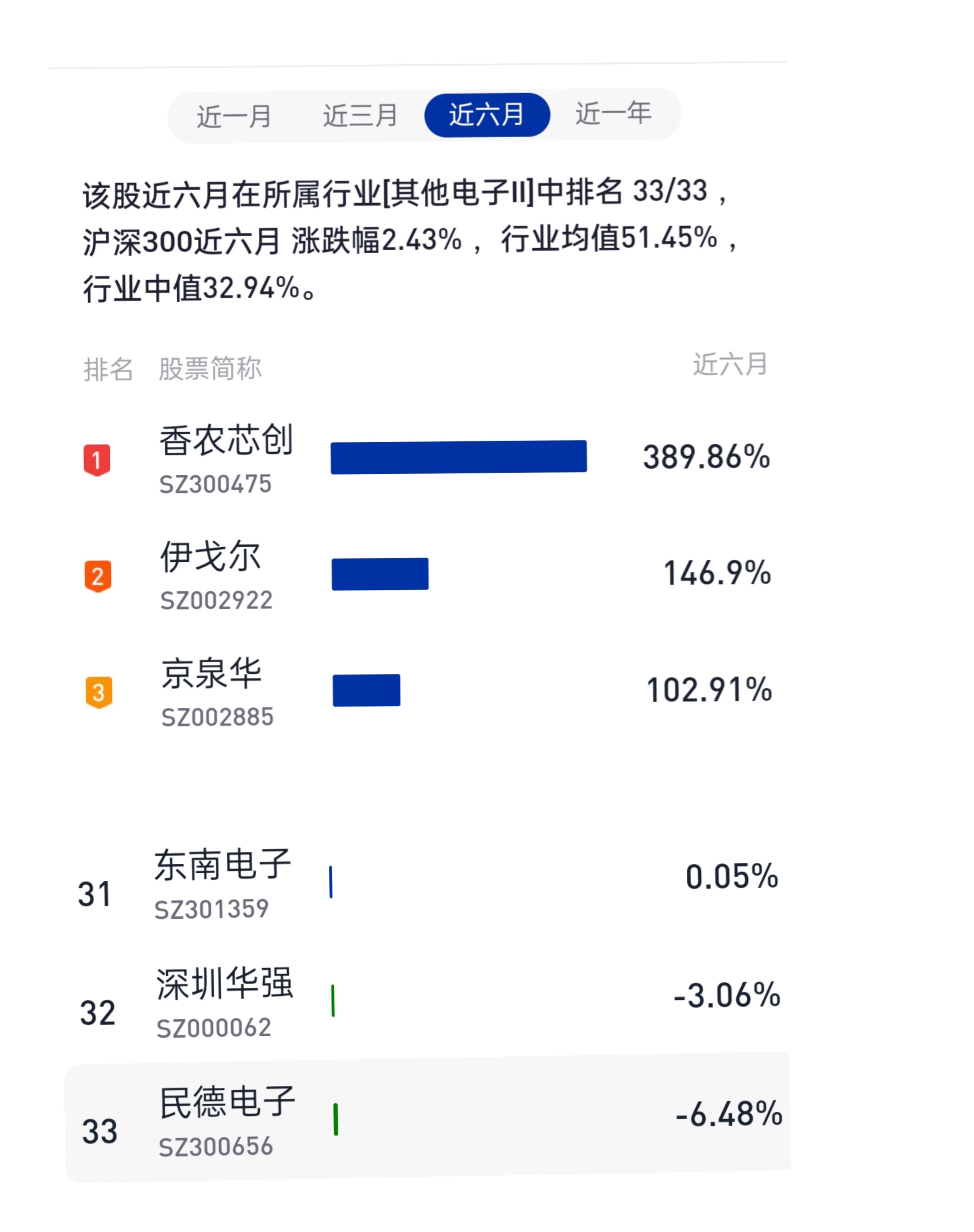 $民德电子(SZ300656)$ 什么破股,半年板块中(共33只股)涨幅垫底!