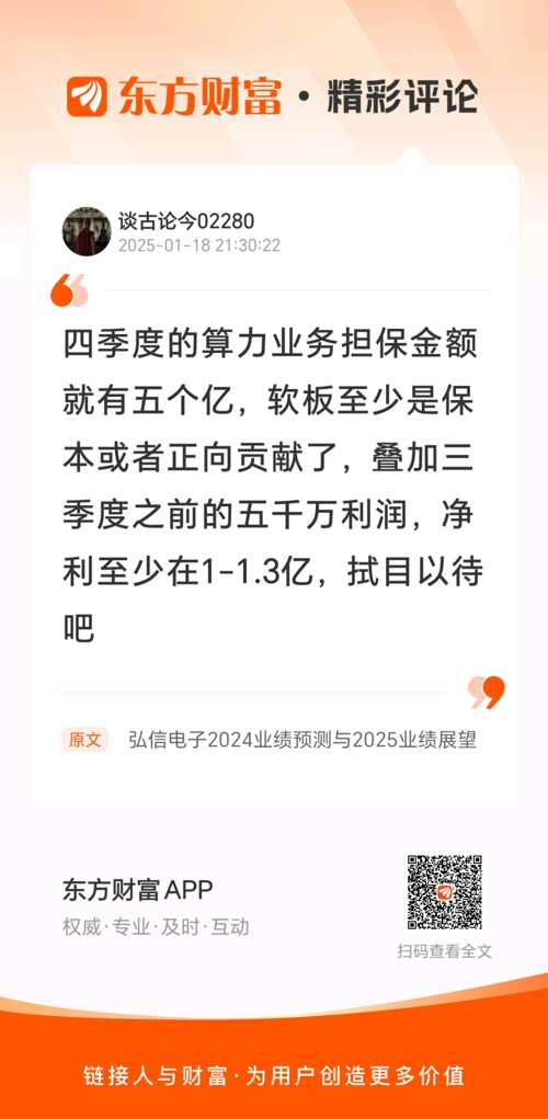 弘信电子//@谈古论今02280 :四季度的算力业务担保金额就有五个亿,软板至少是保本或者正向贡献了,叠加三季度之前的五千万利润,净利至少在1-1.3亿,拭目以待吧