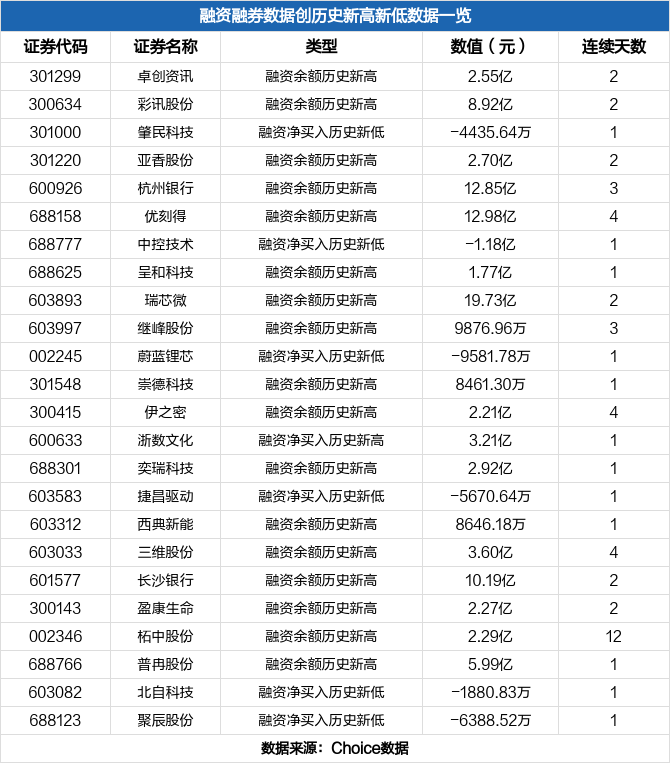 2月13日沪深两市共有112只股票两融数据创历史新高/新低,部分数据如下: