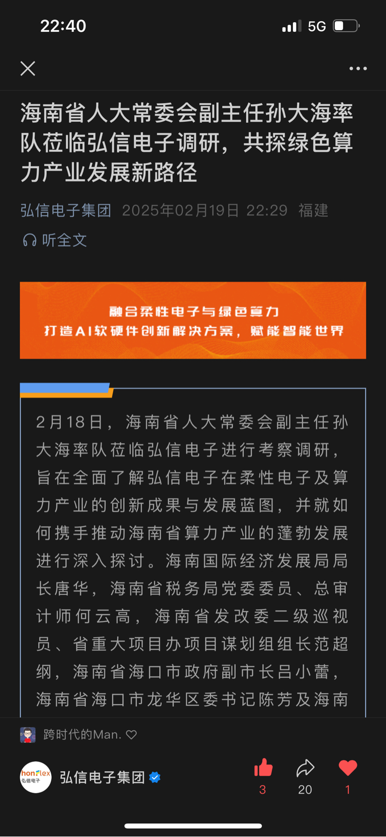 $弘信电子(SZ300657)$ 海南算力的风也吹到了弘信电子!$三丰智能(SZ300276)$ $长盛轴承(SZ300718)$