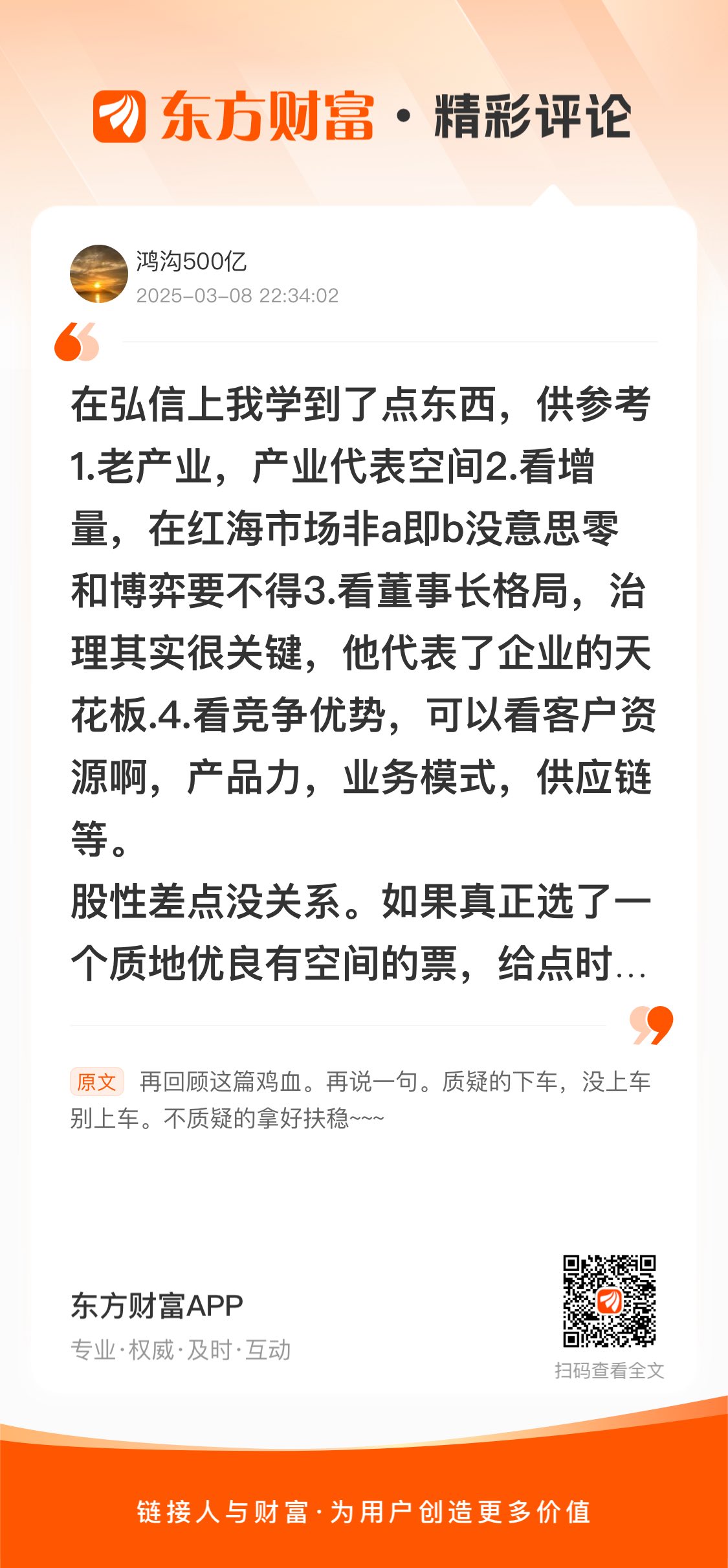 $弘信电子(SZ300657)$ //@鸿沟500亿 : 回复 股友87395L6I60 :在弘信上我学到了点东西,供参考1.老产业,产业代表空间2.看增量,在红海市场非a即b没意思零和博弈要不得3.看董事长格局,治理其实很关键,他代表了企业的天花板.4.看竞争优势,可以看客户资源啊,产品力,业务模式,供应链等。