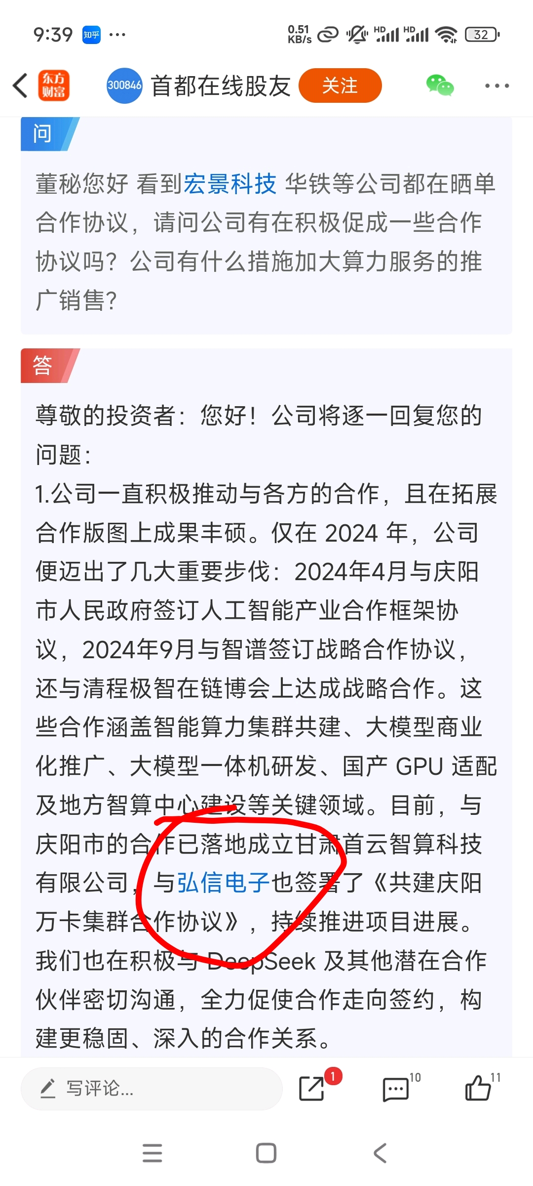 $弘信电子(SZ300657)$ 刚刚在隔壁首都在线,看到人家董秘都点名弘信电子合作了,今天破了支撑位我是真的难受,再跌我是有点扛不住。