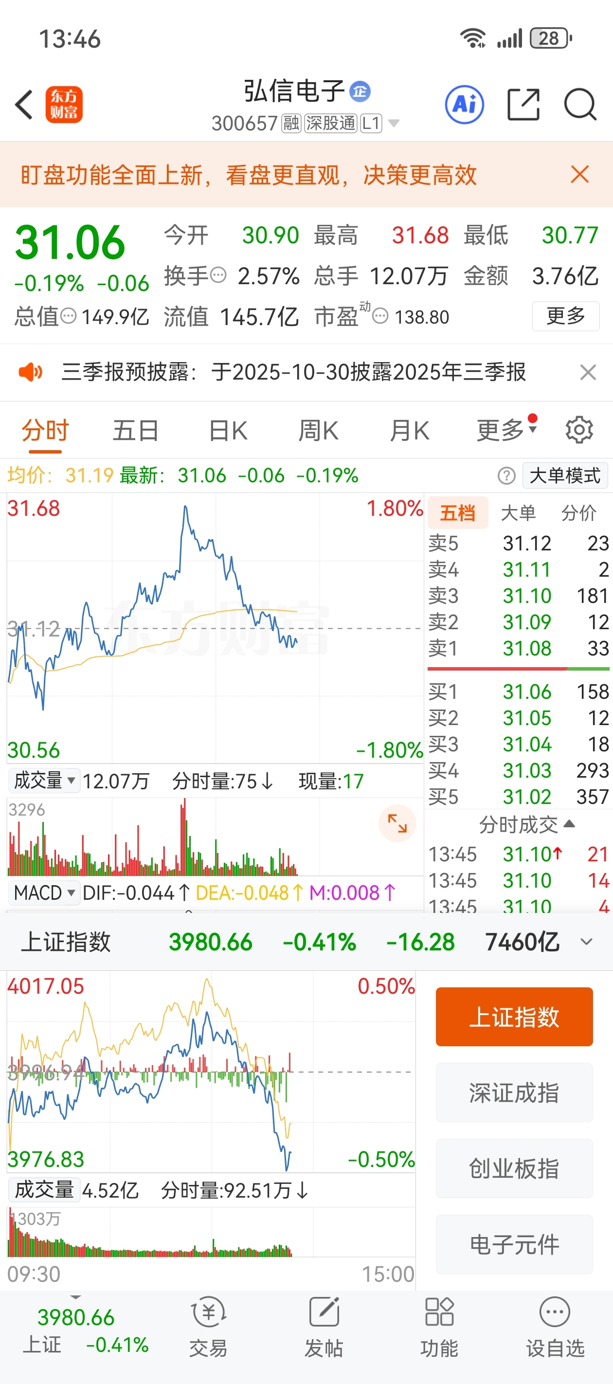 $弘信电子(SZ300657)$ 不知道你有啥好跟的,跌就跟的紧紧的,人家涨又死趴不动
