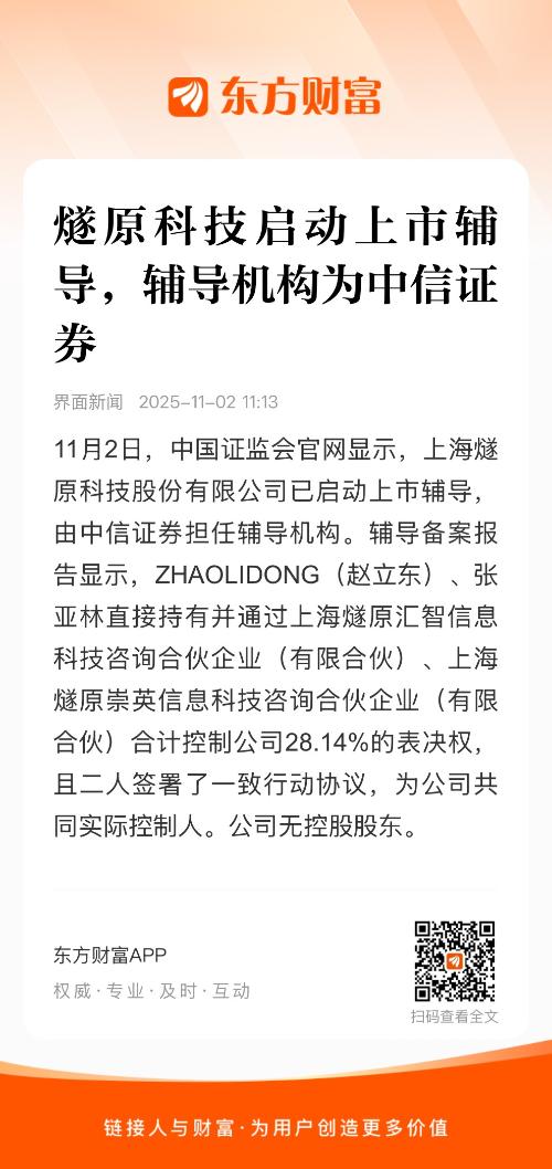 11月2日,中国证监会官网显示,上海燧原科技股份有限公司已启动上市辅导,由中信证券担任辅导机构。辅导备案报告显示,ZHAO LIDONG(赵立东)、张亚林直接持有并通过上海燧原汇智信息科技咨询合伙企业(有限合伙)、上海燧原崇英信息科技咨询合伙企业(有限合伙)合计控制公司28.14%的表决权,且二人签署了一致行动协议,为公司共同实际控制人。公司无控股股东。