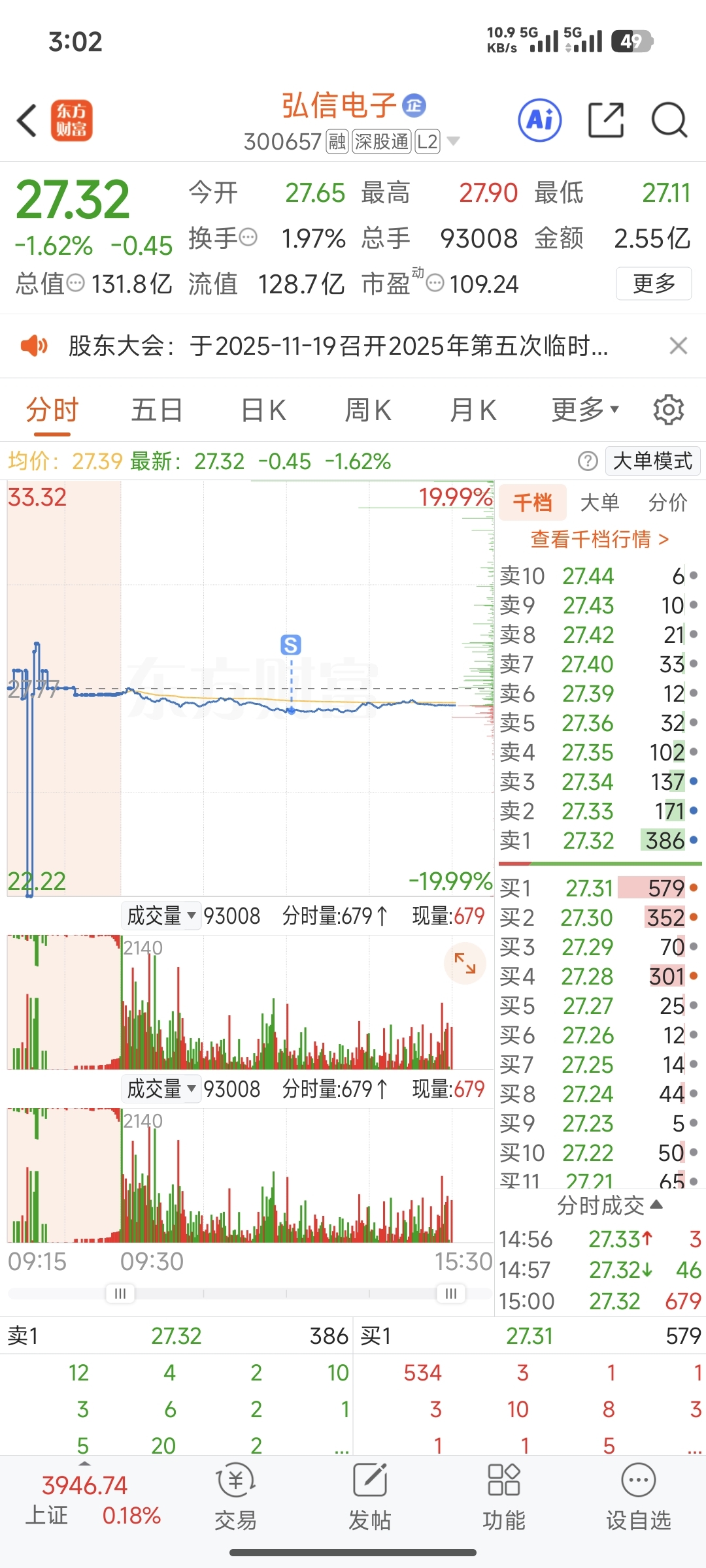 $弘信电子(SZ300657)$ 顶不住了兄弟们,先撤了@弘信电子 @弘信电子 集团 $古麒绒材(SZ001390)$