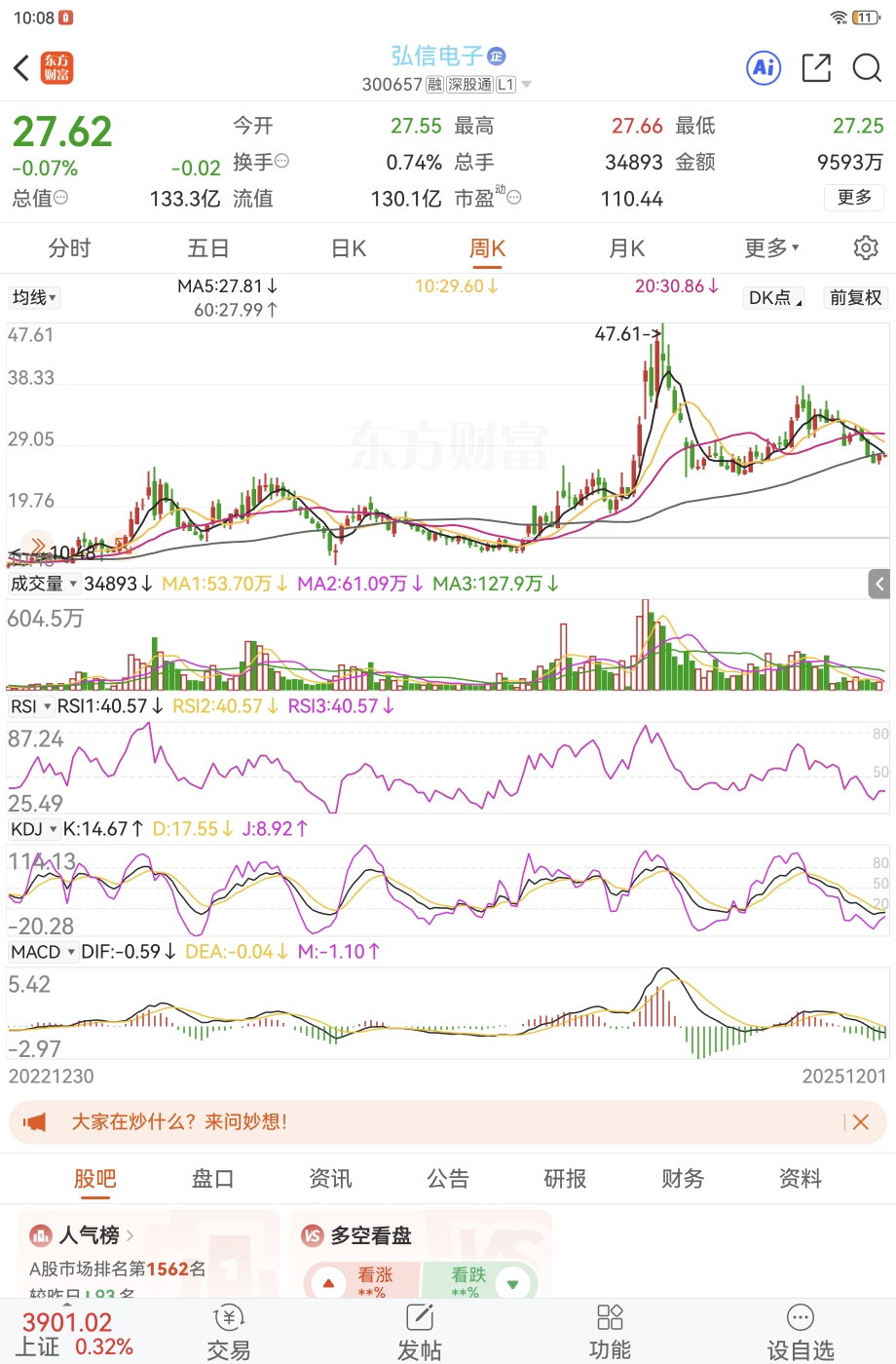 $弘信电子(SZ300657)$ 周K60周期的27.99能否尽快收复是关键!