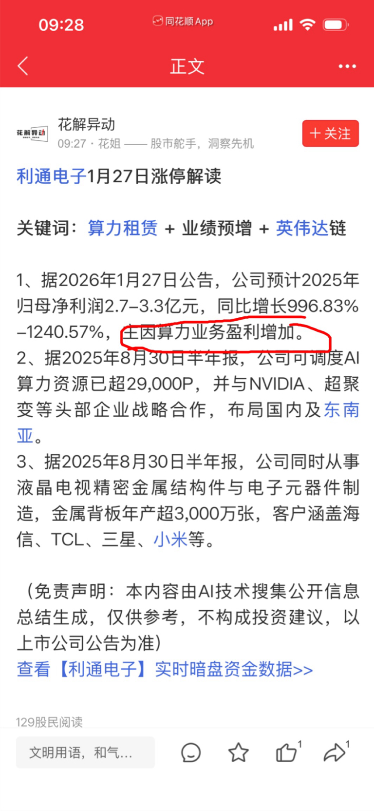 利通电子涨停!业绩大增,主要是算力业务盈利增加,你的公告啥时候出来,也跟着涨一下