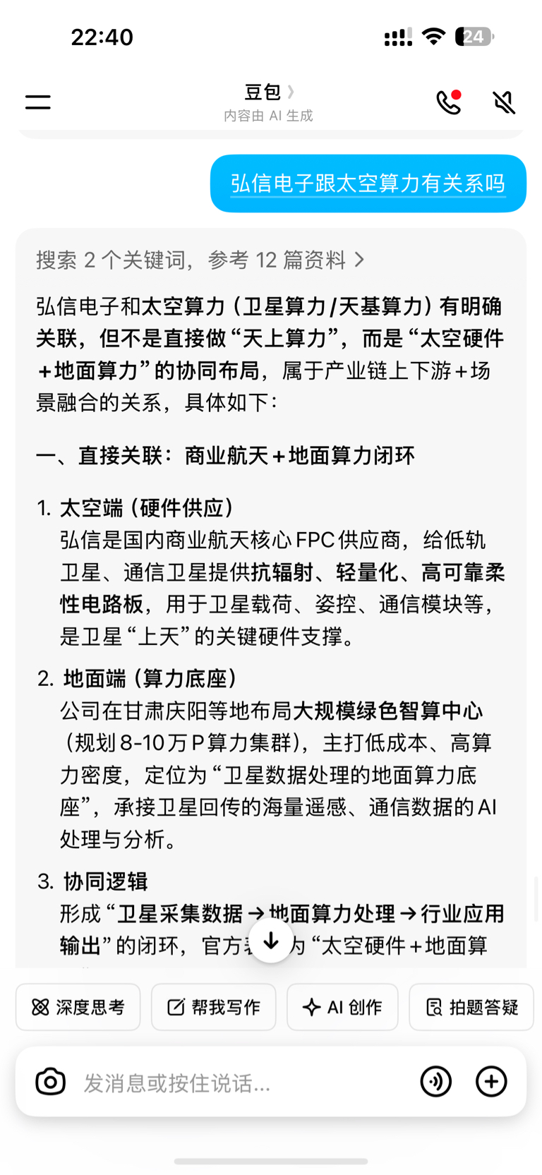 $弘信电子(SZ300657)$ @妙想 弘信电子和太空算力有关系吗?