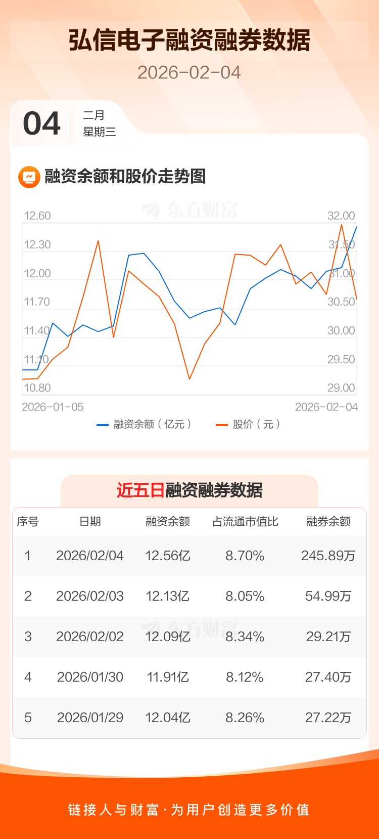 交易所最新数据显示,弘信电子于2026年2月4日获融资买入1.42亿元,融资偿还9873.23万元,当日融资净买入4358.47万元。目前,该股融资余额12.56亿,占流通市值比例为8.70%。