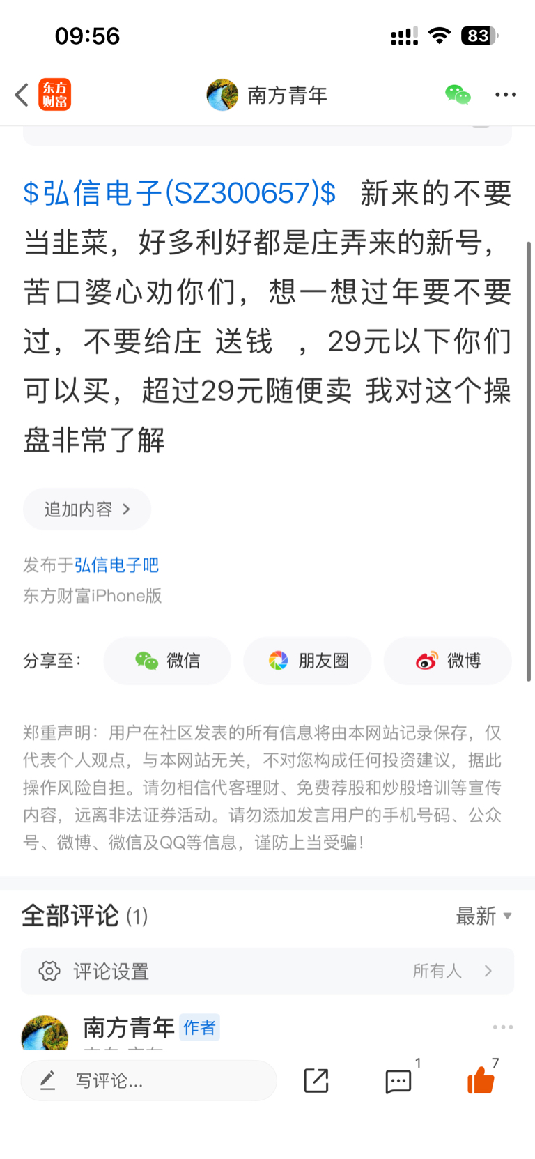 温馨提示: 1.根据《证券法》规定,禁止编造、传播虚假信息或者误导性信息,扰乱证券市场;2.用户在本社区发表的所有资料、言论等仅代表个人观点,与本网站立场无关,不对您构成任何投资建议。用户应基于自己的独立判断,自行决定证券投资并承担相应风险。《东方财富社区管理规定》