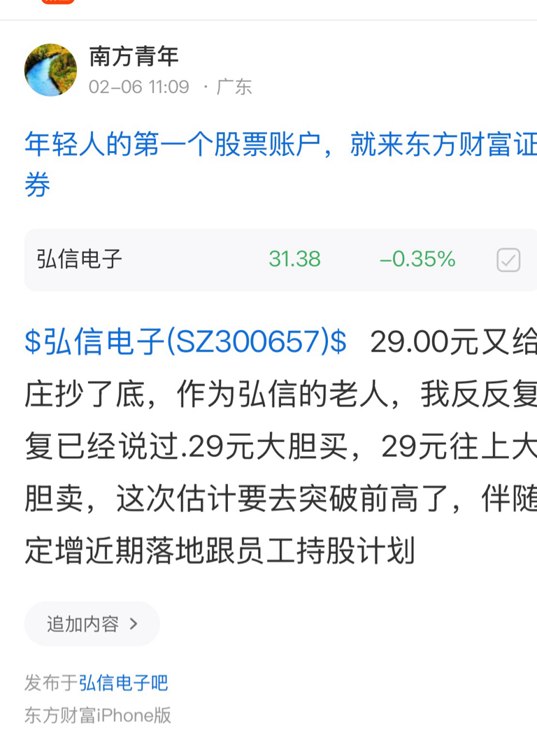 $弘信电子(SZ300657)$ 作为弘信电子的老人。我在 2 月 6 号已经说过,主力在 29 已经达大幅度地拿到了筹码,抄了散户的底。那么今天这个早市的话,是在进行 32 块点 5 这个压力位的进行,来试探测试。看明天、今明两天能否突破。是一个关键,如果突破不了,那么还需要进行下来震荡,进行洗盘。但是最终一点,还是要突破 32.5 。
